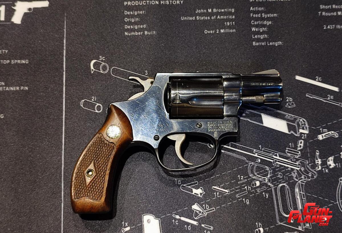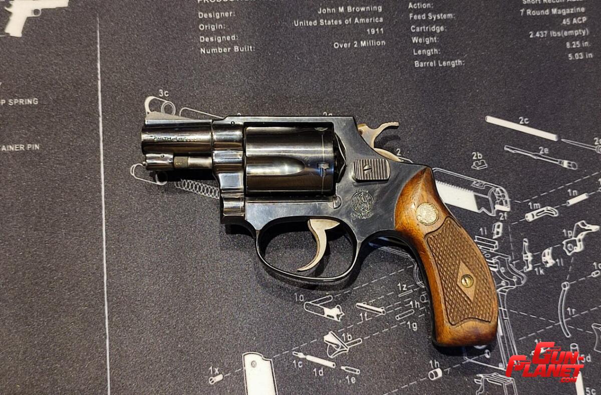 SMITH & WESSON 36: Cal. 38 Special. Capacidad de 5 tiros. Simple y doble acción. Cañón de 2". Alza fija . Terminación pavón (original 10 puntos, la foto puede engañar) . Cachas anatómicas de madera.