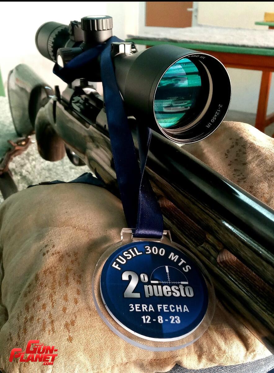 >> Hola buen dia. La verdad no tengo ni idea, ademas lo compre usado. A 150 mts agrupa en una moneda de un pesos y a 300 en cuadrado de 5x5 con recarga propia