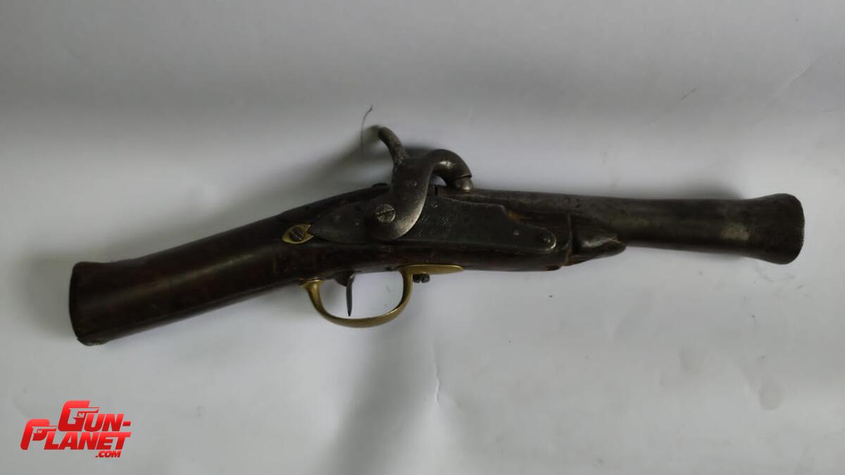 • Descripción y Estado de Conservación: Arma de percusión con un característico cañón corto de gran calibre y boca abocinada, diseñado para disparar postas. Guardamontes de latón y culata robusta.
