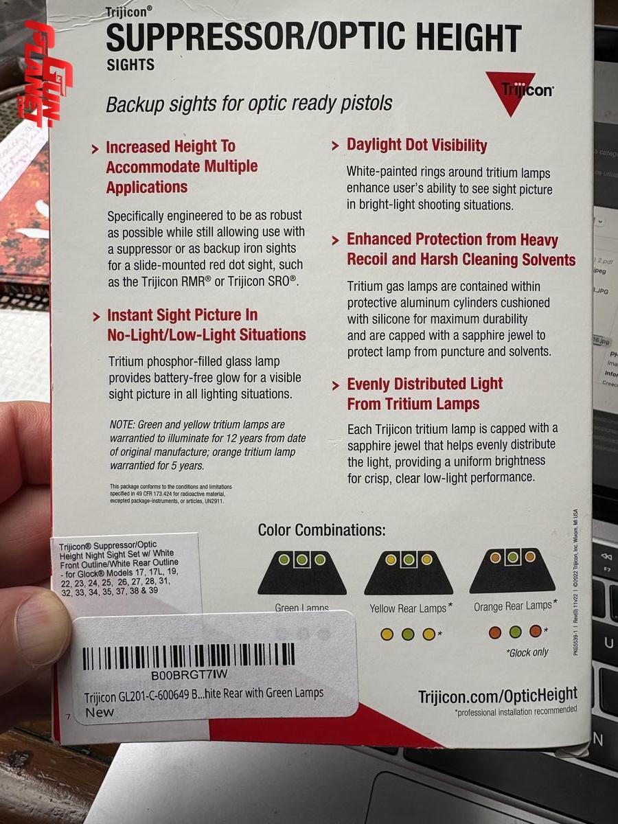 Las miras de altura Trijicon® ideales para un mejor encara y compatibles con con supresor y miras de punto.Son miras de hierro de tres puntos que aumentan la precisión de disparo nocturno hasta cinco veces en comparación con las miras convencionales. Igualmente impresionantes, lo hacen con la misma velocidad que el disparo instintivo, y sin necesidad de baterías. Alojadas en un cuerpo metálico y acolchadas con silicona, las miras de altura Trijicon® con supresor/óptica presentan un diseño único resistente a los impactos. Cada lámpara está cubierta con una gema de zafiro que distribuye la luz uniformemente, protegiéndola de disolventes y perforaciones. Dentro de cilindros de aluminio para mayor protección, las lámparas están montadas sobre almohadillas de silicona para resistir impactos y retrocesos fuertes. Las lámparas Green tienen una garantía de 12 años a partir de la fecha de fabricación.