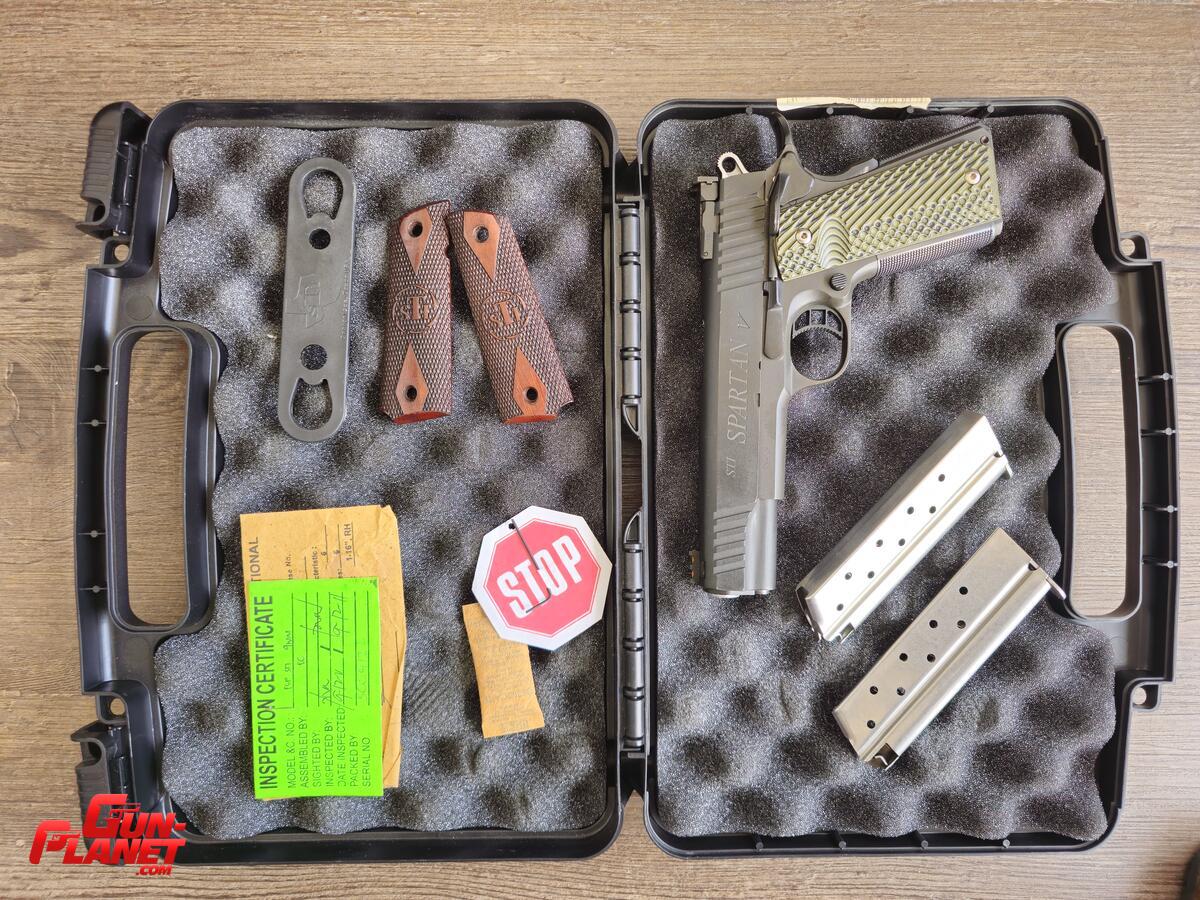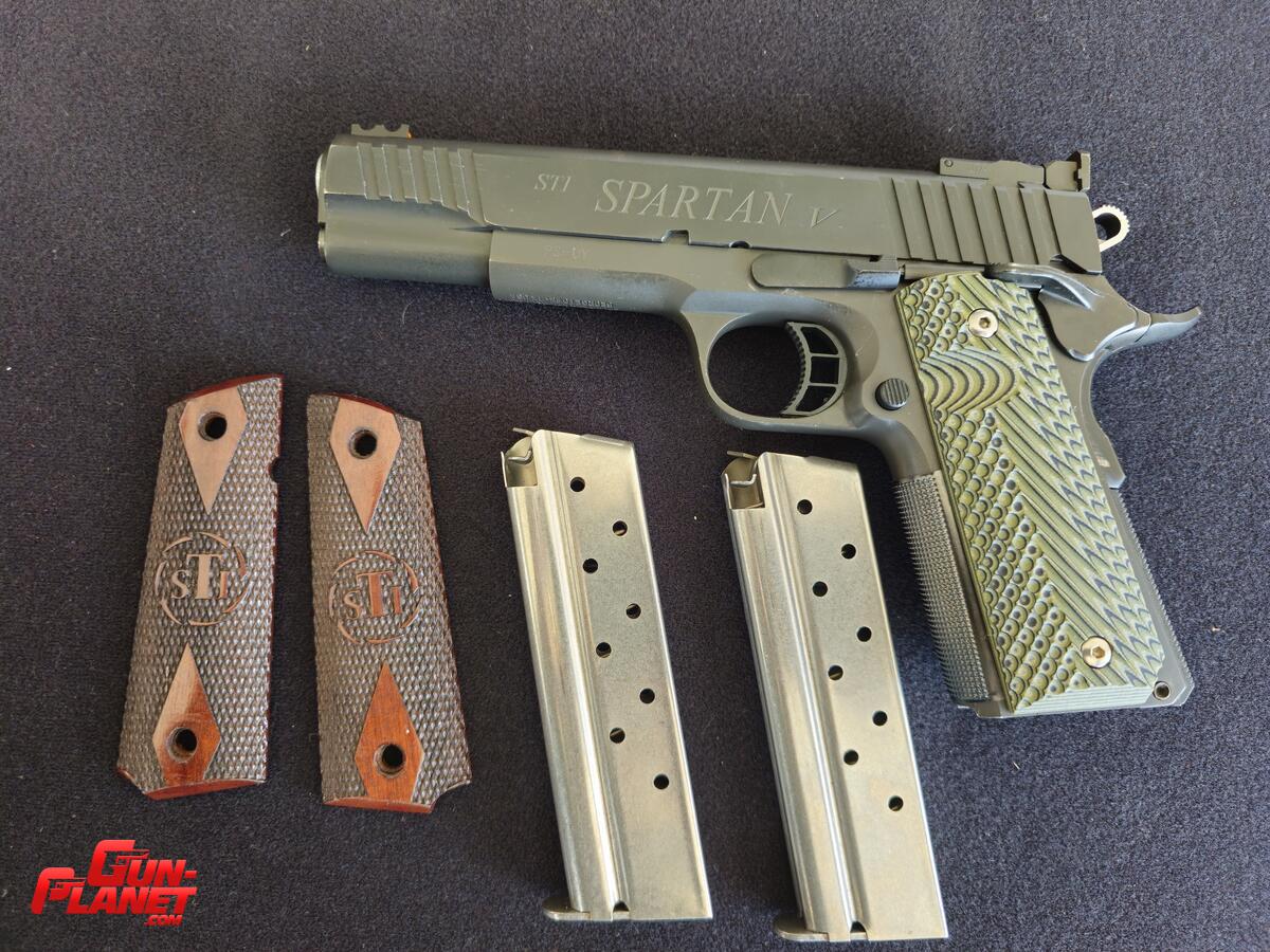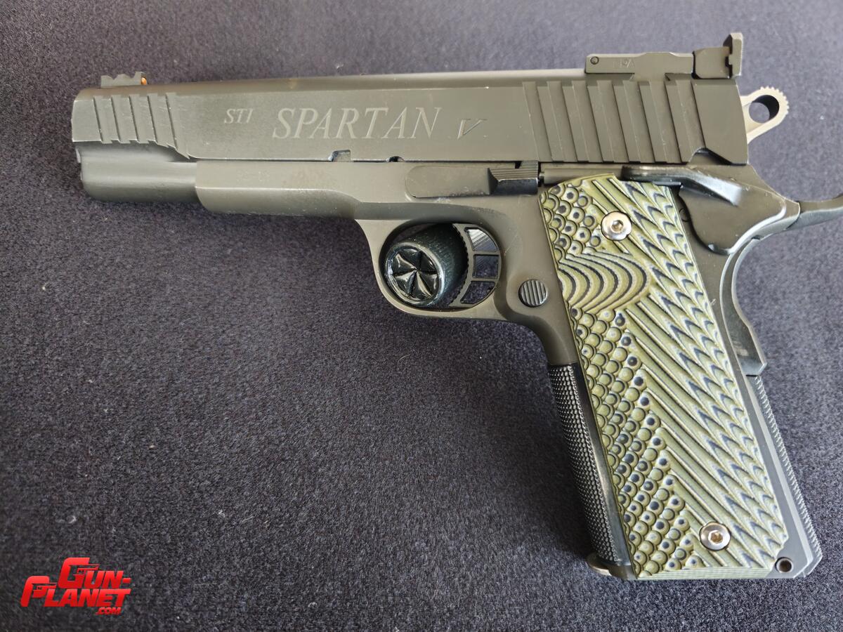 Pistola STI modelo Spartan V, cañón 5", mirsas regulables, dos cargadores, cachas custom de G10 con tornillos inox, segundas cachas originales de nogal, guia extendida, 2 cargadores, segrinado de la empuñadura Wilson Combat y gatillo de 3 Lbs. Casi sin uso, no se usó nunca para competencias IPSC. Ideal para empezar en categoría Classic.