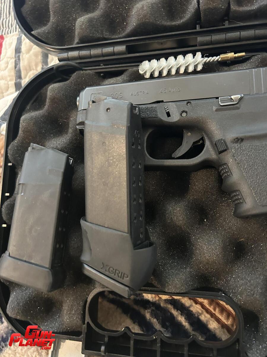 Pistola Glock 30S Cal 45ACP. En impecable estado, con 3 cargadores, Uno de 13 tiros + XGRIP, con retén de corredera extendido, resortes alivianados, desconectar de 3,5lbs. Con todos los accesorios originales. Tiene CUIM, se transfiere en el ANMAC del TFA. No hago permutas ni envios.