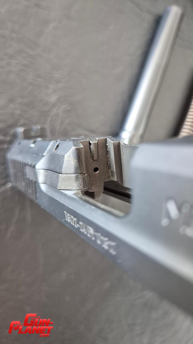 Y mejorada con mira de fibra optica marca canik y le pinte de negro los 2 puntos blancos traseros con un Sharpie. Facil y efectivo.