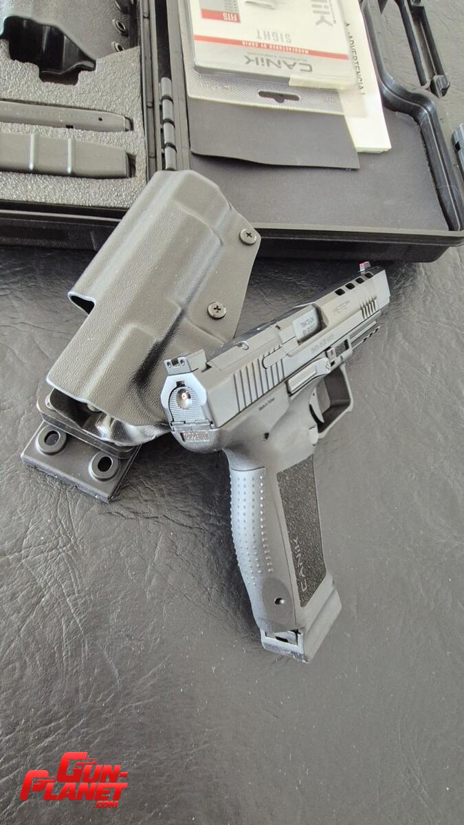 Backstrap adicional, Holster marca canik, platos para miras opticas, embudo, baquetas, punch, cargador rapido y 2 cargadores de 18 tiros.