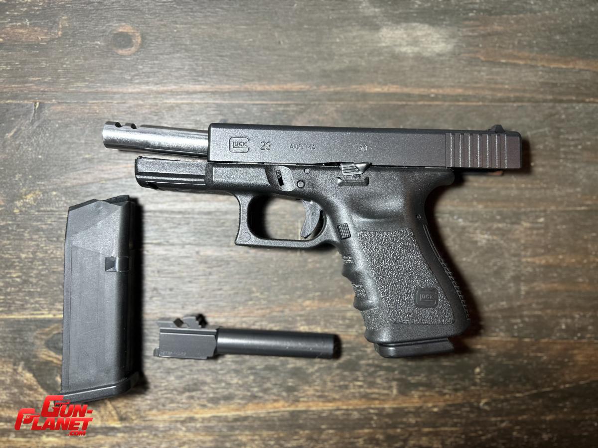 Pistola Glock 23 Cal. 40 SW. Cuenta con dos caños, uno original y otro de acero inoxidable con portet, retén de corredera extendido, desconectar de 3,5lbs y resortes alivianados, muy suave. Viene con dos cargadores, manuales y caja original. Tiene CUIM, se transfiere en el TFA. No hago envíos ni permutas.
