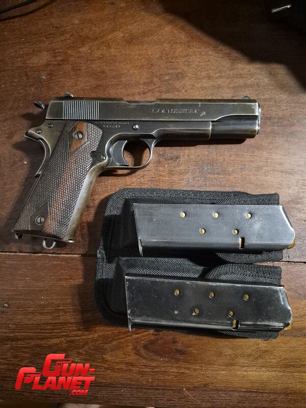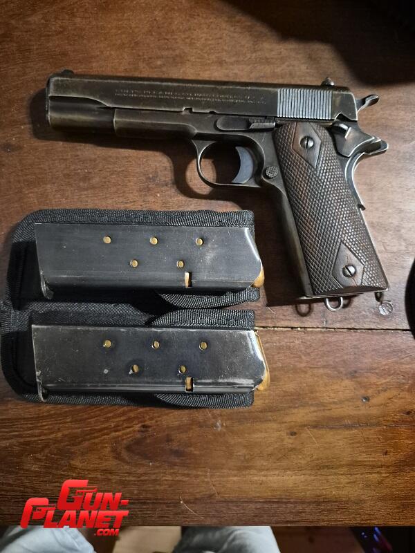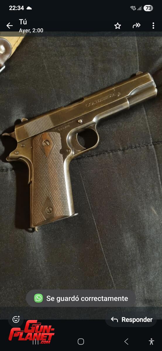 Colt Government Mod 1911 -NO A1- año 1916. Totalmente original. En perfecto estado general y de funcionamiento. Con su cargador original y dos más originales .45 AUTO. Portacargadores nuevo. Pavon algo desgastado original. Poseo pistolera cruzada de pecho Zafra impecable y nueva que se vende aparte. Por razones de comodidad y portabilidad, aceptaría permuta por Smith & Wesson Modelo 10-7 o Colt de 2" de cañón en óptimas condiciones ( sin repavonado ni modificaciones de ningún tipo) como parte de pago. Diferencia a mi favor a convenir.