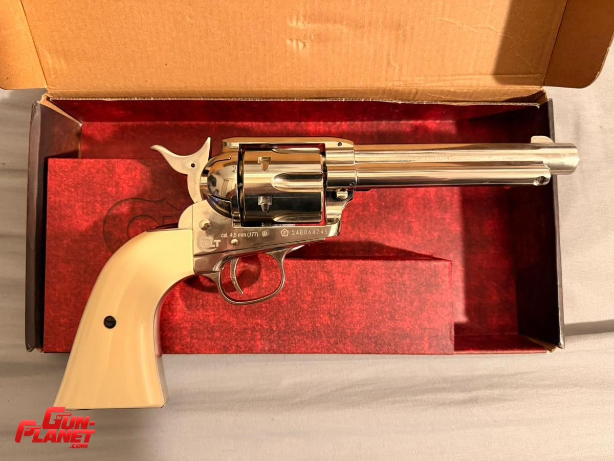 Revólver Umarex Colt Single Action Army (SAA) calibre 4,5 mm (.177 BB), réplica oficial licenciada por Colt, diseñada para coleccionistas y tiro recreativo. Reproduce fielmente el clásico revólver del Viejo Oeste, con excelente nivel de realismo, peso y terminaciones.