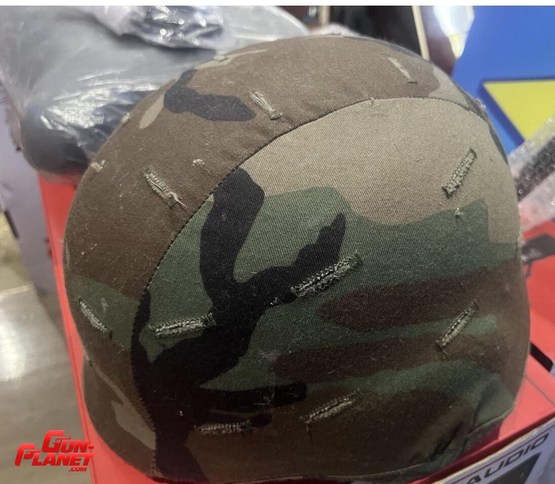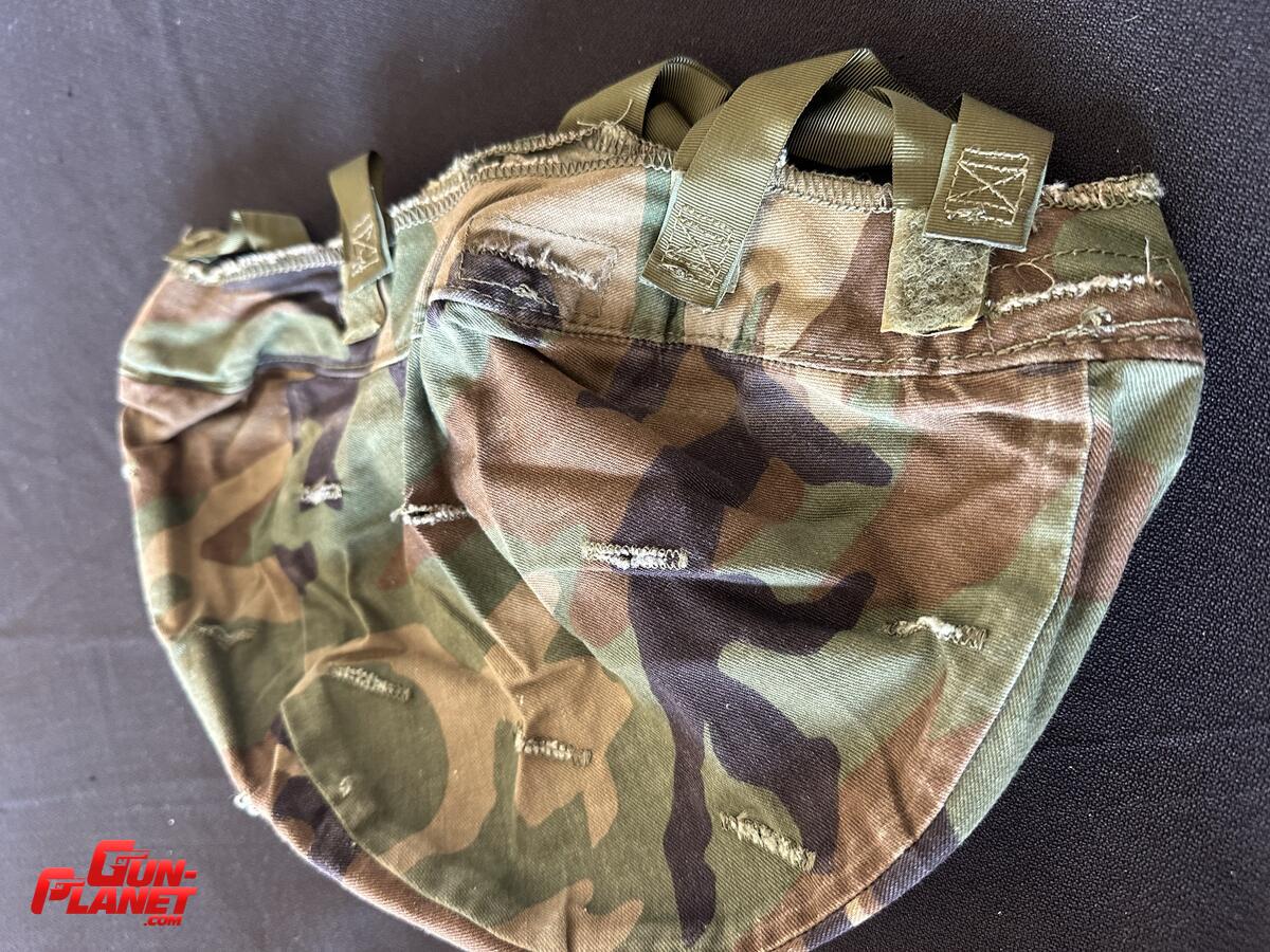 The woodland helmet cover is a fabric cover designed to camouflage military helmets, typically in the M81 Woodland pattern, which features green, brown, black, and tan for forest environments. These covers are secured to the helmet with hook-and-loop tabs or drawstrings and help reduce glare, noise, and visibility in tactical settings. Used primarily from the **1980s to the early 2000s**, they fit various helmet types, like the PASGT or MICH helmets, and are durable enough to withstand rough field conditions.