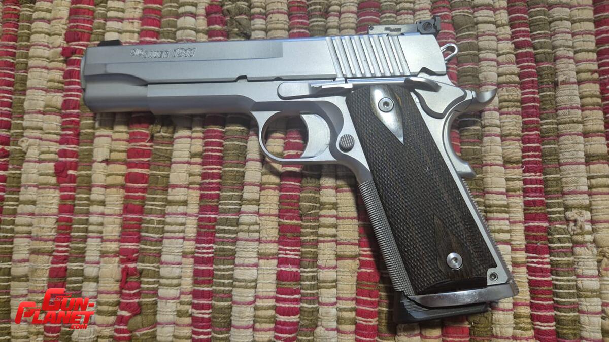 Pistola Semiautomática calibre 45 ACP, Sig Sauer Modelo Target 1911, acero inoxidable,embudo, martillo de competición. Caja, manual, dos cargadores. Con CUIM valor 2800 dólares.