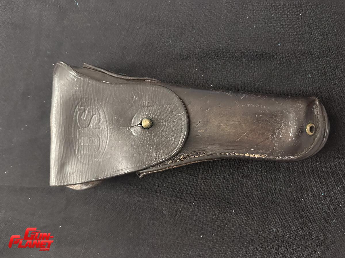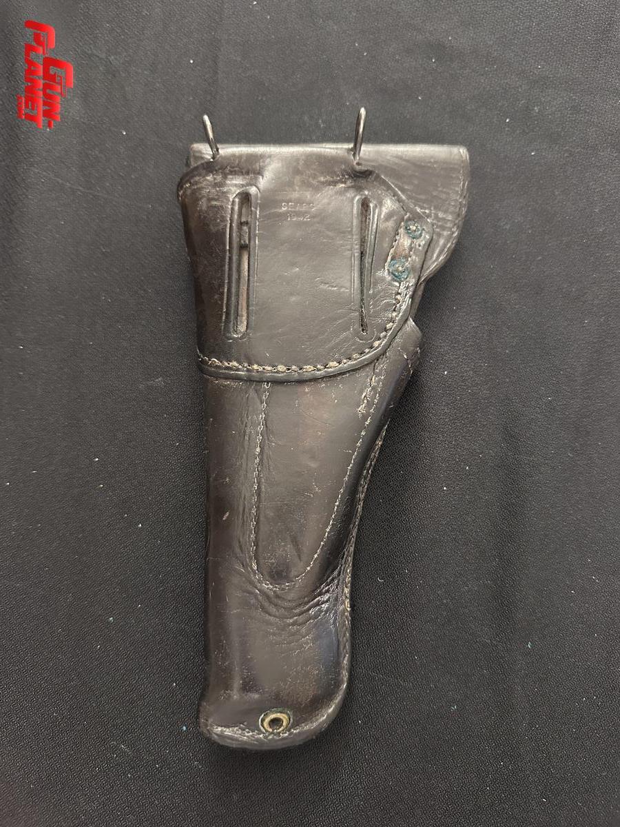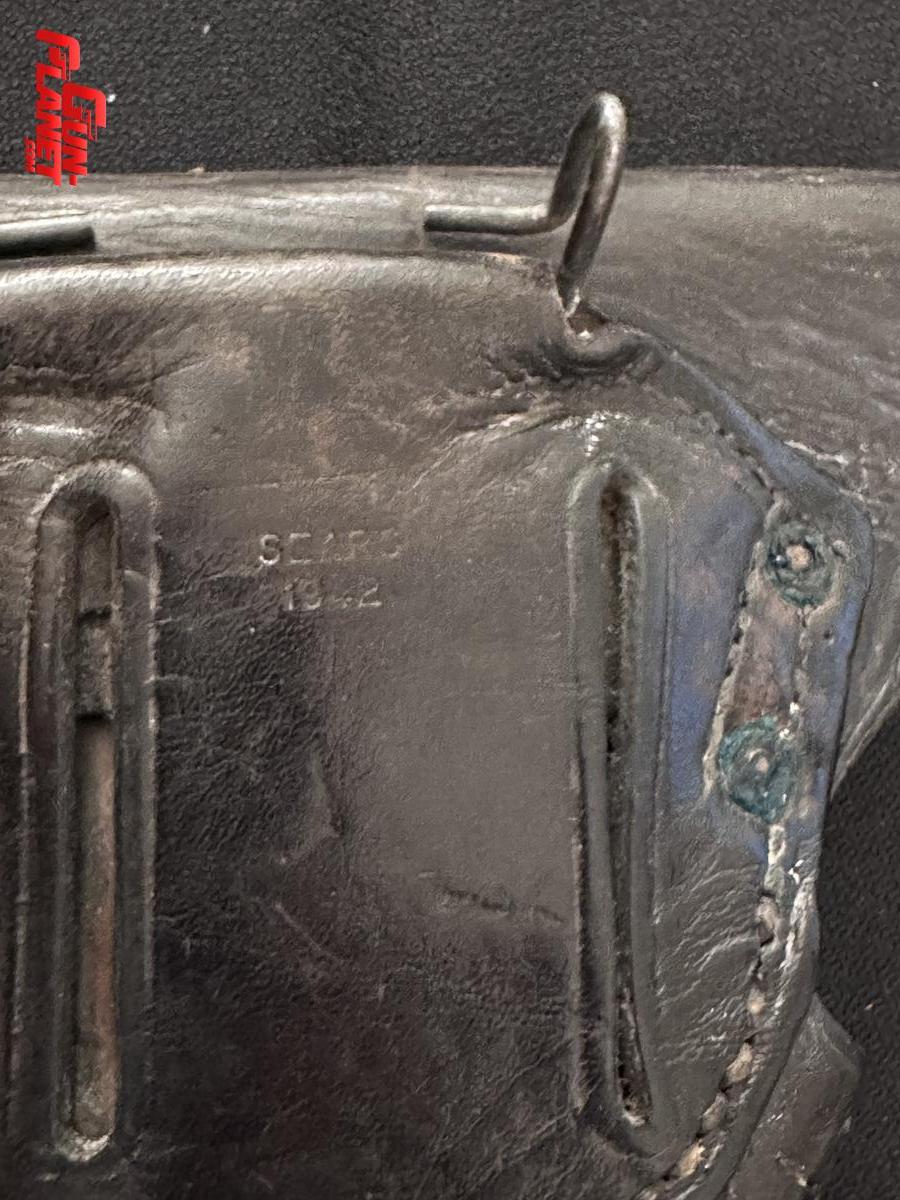 El artículo de cuero mostrado es una funda de pistola estadounidense, datada en 1942, fabricada por Sears, Roebuck and Company. El nombre “SEARC.” visible en el cuero es una abreviatura del fabricante, comúnmente encontrada en equipamiento militar de la Segunda Guerra Mundial.