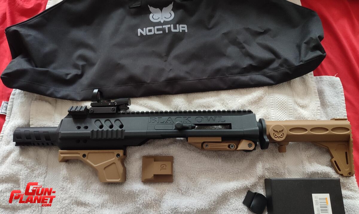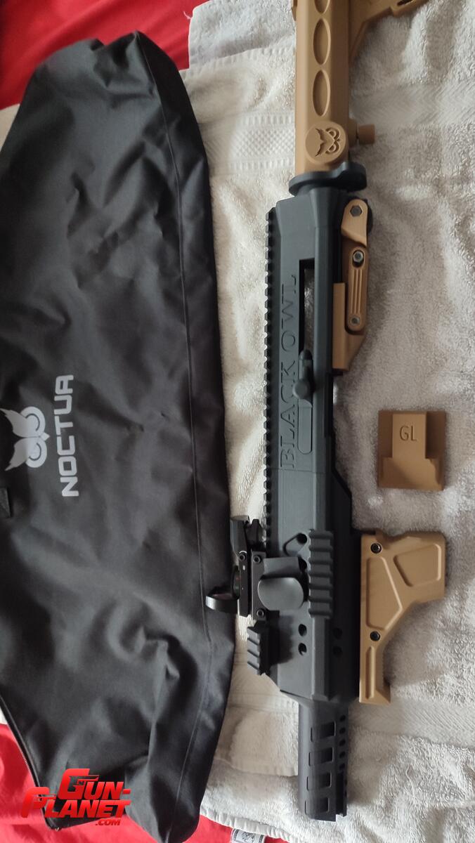 Con mira holográfica reticulos en rojo y verde.( rajada en una esquina que no afecta su funcionamiento) Viene en su bolso con cierre para facil traslado armado o desarmado.