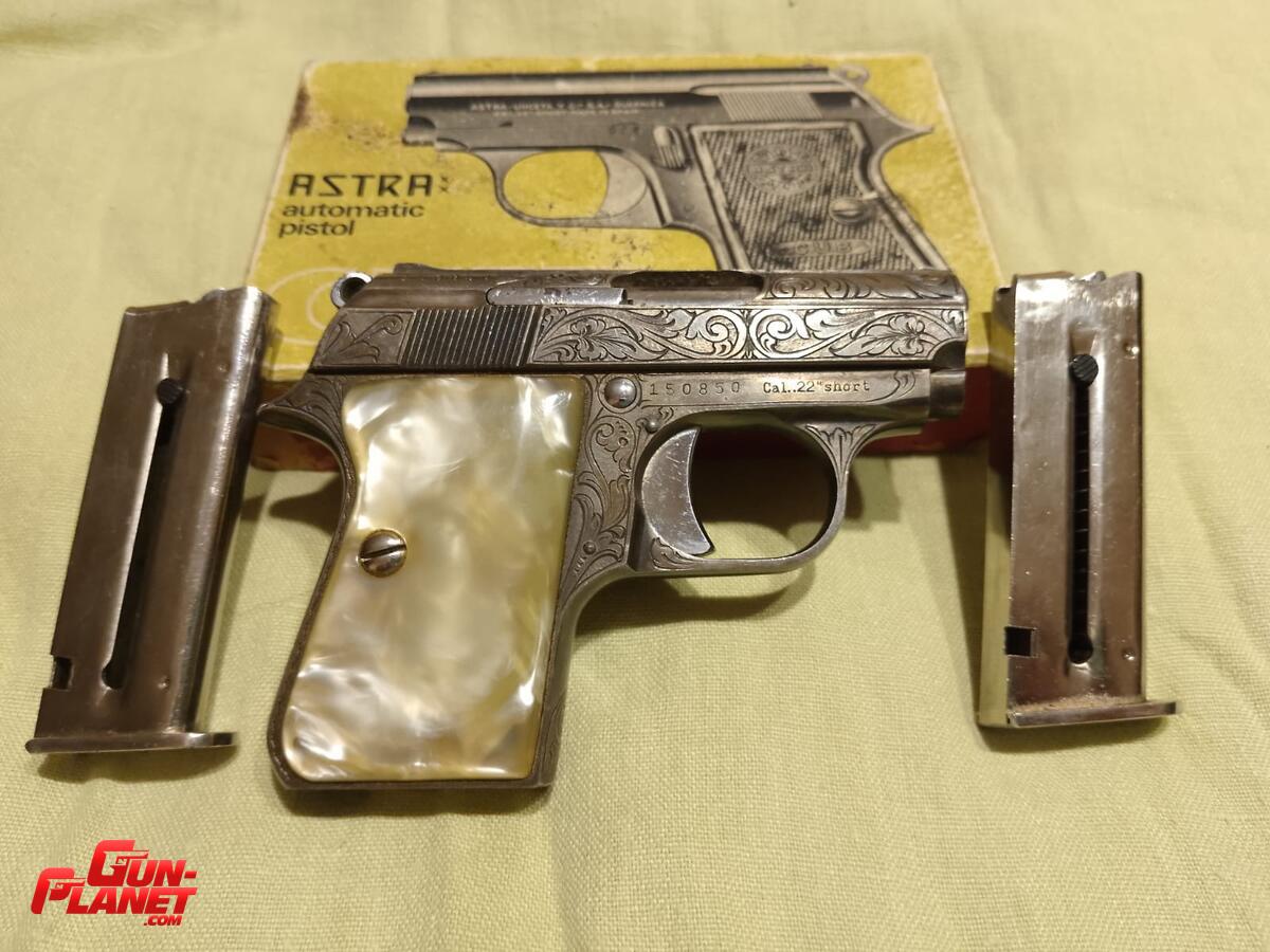 Pistola Astra CUB 22 corto con cachas de nácar y en su caja original.