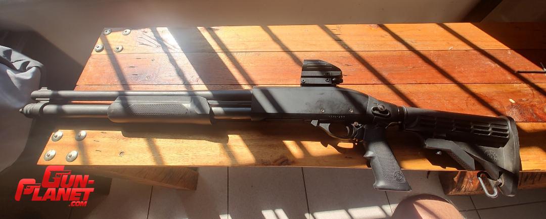Escopeta a repetición marca Akkar modelo Stopping Power, cal 12/76-12/70, tiene colocada culata táctica retractil tipo ar15 con pistola grip marca Taurus. Con la mira holográfica (china) son 80k más que el precio publicado