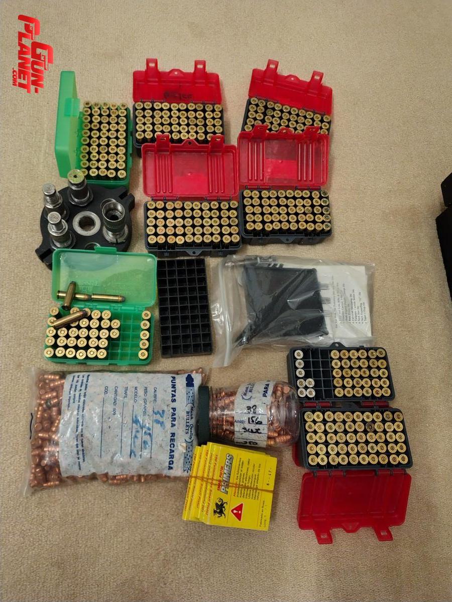 Impecabilisimo y muy sólido simple acción Inox caño de 4plg con 5/8 de largor Sale con todo lo exhibido 500 fulminanteS APROX 650 puntas cobreadas 70 vainas para recargar 4 cajas plásticas importadas con Muni de recarga liviana 35 balas factory todas las vainas son Magtech cartuchera de cuero estuche ruger y su manual juego completo de dies montados en disco Lyman listos para recargar ya están regulados