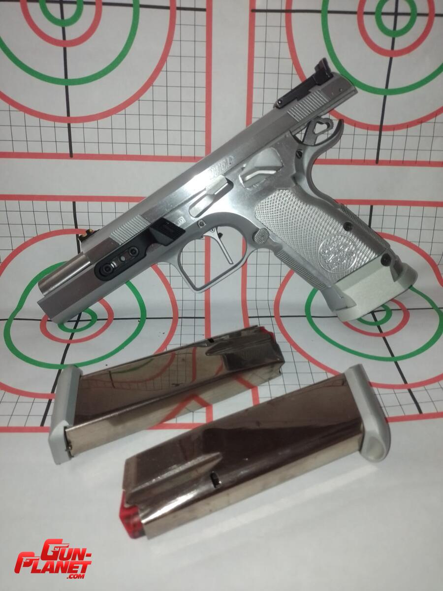 Pistola calibre 40 Limited Custom con accesorios, Gatillo recto, cachas de Aluminio, guion de fibra, apoyo para pulgar, seguro extendido ambidiestro, aguja percutora y una extractora nuevas, usada solo en pedana y con munición de recarga
