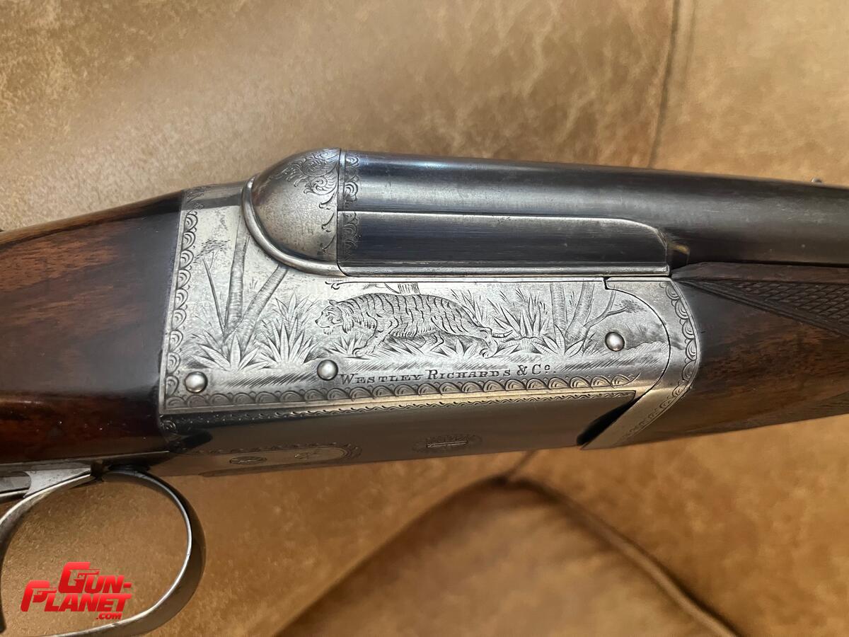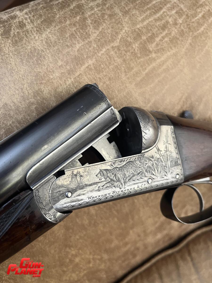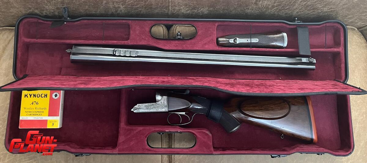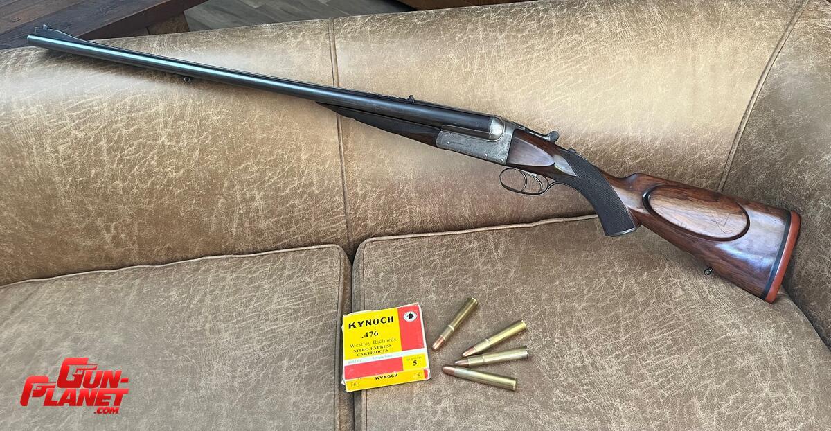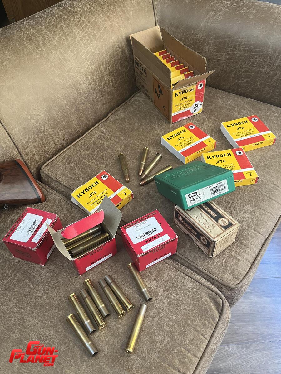 Rifle doble Westley Richards calibre .476 Nitro Express. Abundante munición Kynoch, 60 vainas Bertram boxer nuevas y puntas Woodleigh, todos insumos contemporáneos premium. Dies y shell holder RCBS. Exquisito inglés para entendidos.