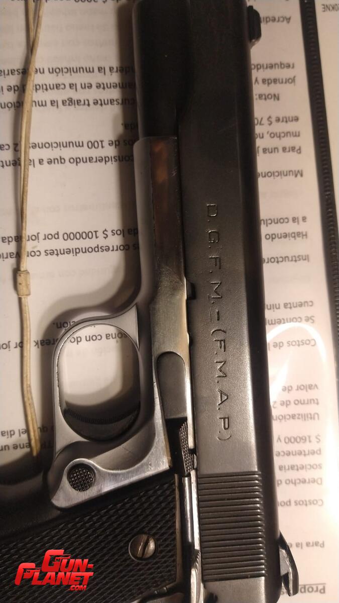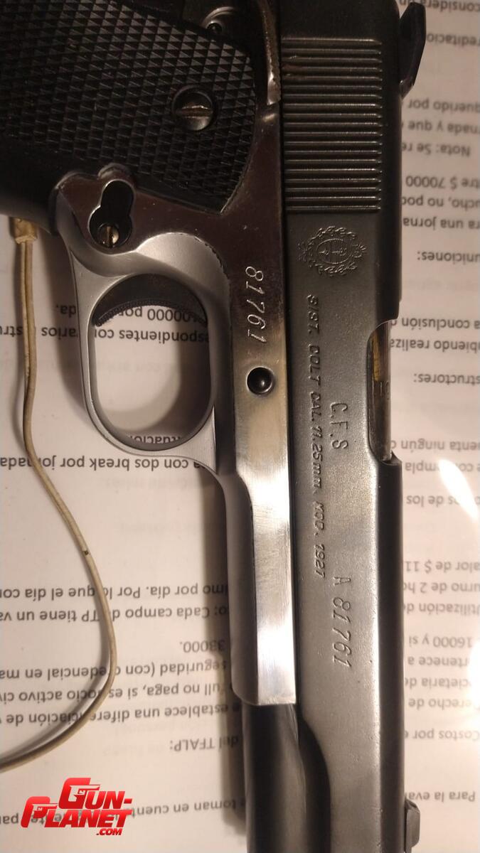 Pistola FM 1927 Calibre 45 ACP Bitono, ien excelente estado, Alza de combate con dos puntos, guión de combate con punto, corredera pavonada alcalino, seguro de aleta ambidiestro extendido, cachas colocadas genéricas anatómicas, mas juego de cachas vaquelita negra mas cachas vaquelita con bandera argentina, dos cargadores de 7 municiones uno con apoya dedo (colocado en fotos) y otro común escucho ofertas