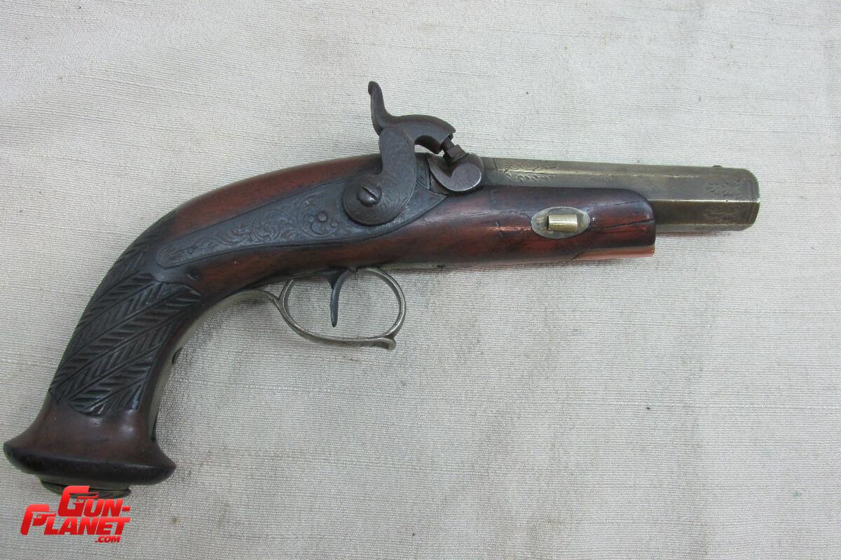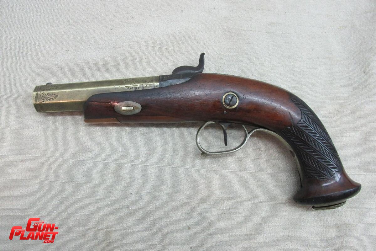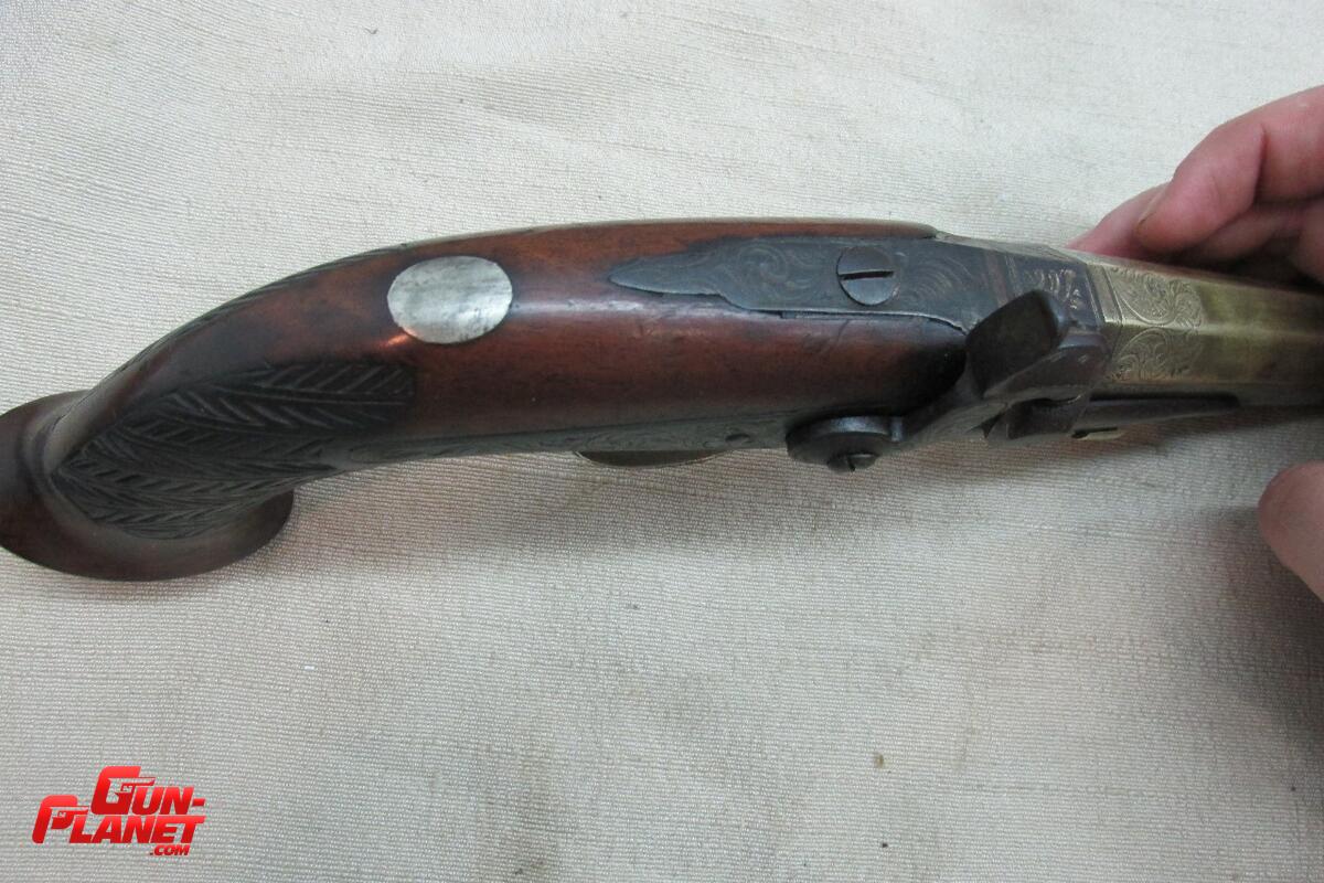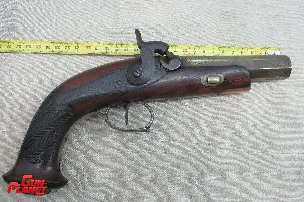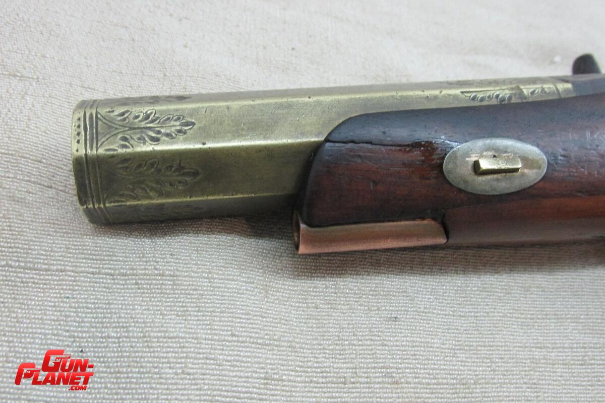 pistola a percusion de 1850 caño de bronce octogonal posiblemente belgica con cup box inferior detalles de lujo calidad