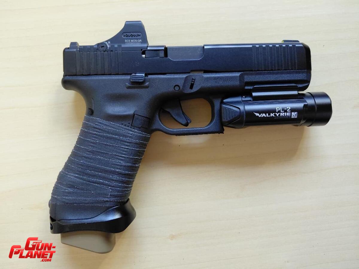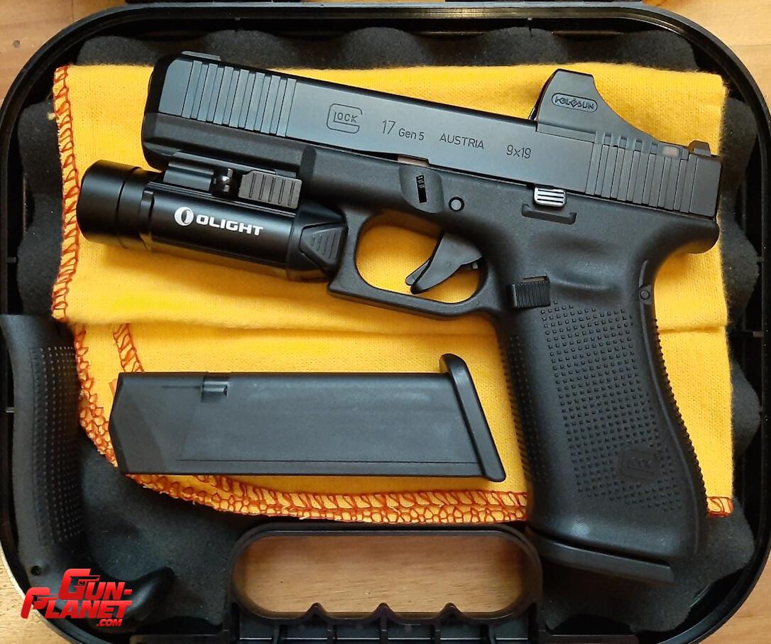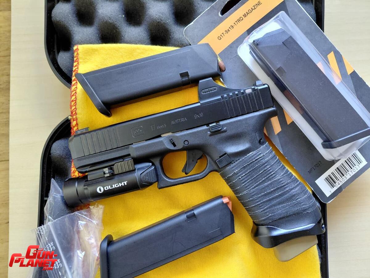- ADICIONALES: 1 cargador Glock de G19X con extensión +2 color FDE, 1 cargador Glock en caja sin abrir para G17 Gen4 (follower negro), linterna Olight PL-3 Valkyrie, magwell metálico, pistolera externa de Kydex mano derecha marca MV-Kydex y pistolera interna plástica mano derecha marca Houston.