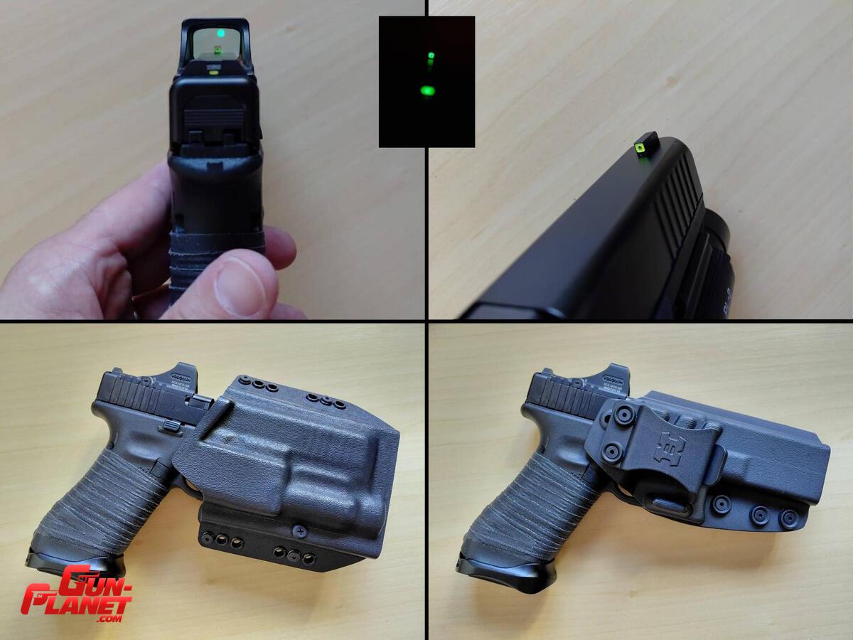 - ACCESORIOS: Gatillo Glock Performance Trigger para Gen5, mira de punto verde Holosun SCS, miras metálicas Ameriglo CAP Sight GL-5614 con Tritium en guión (permiten perfecto cowitness con la mira electrónica SCS), 2 cargadores originales de 17 cartuchos, caja original, baqueta de limpieza, ayuda para cargar, miras plásticas originales (alza y guión) y gatillo original.