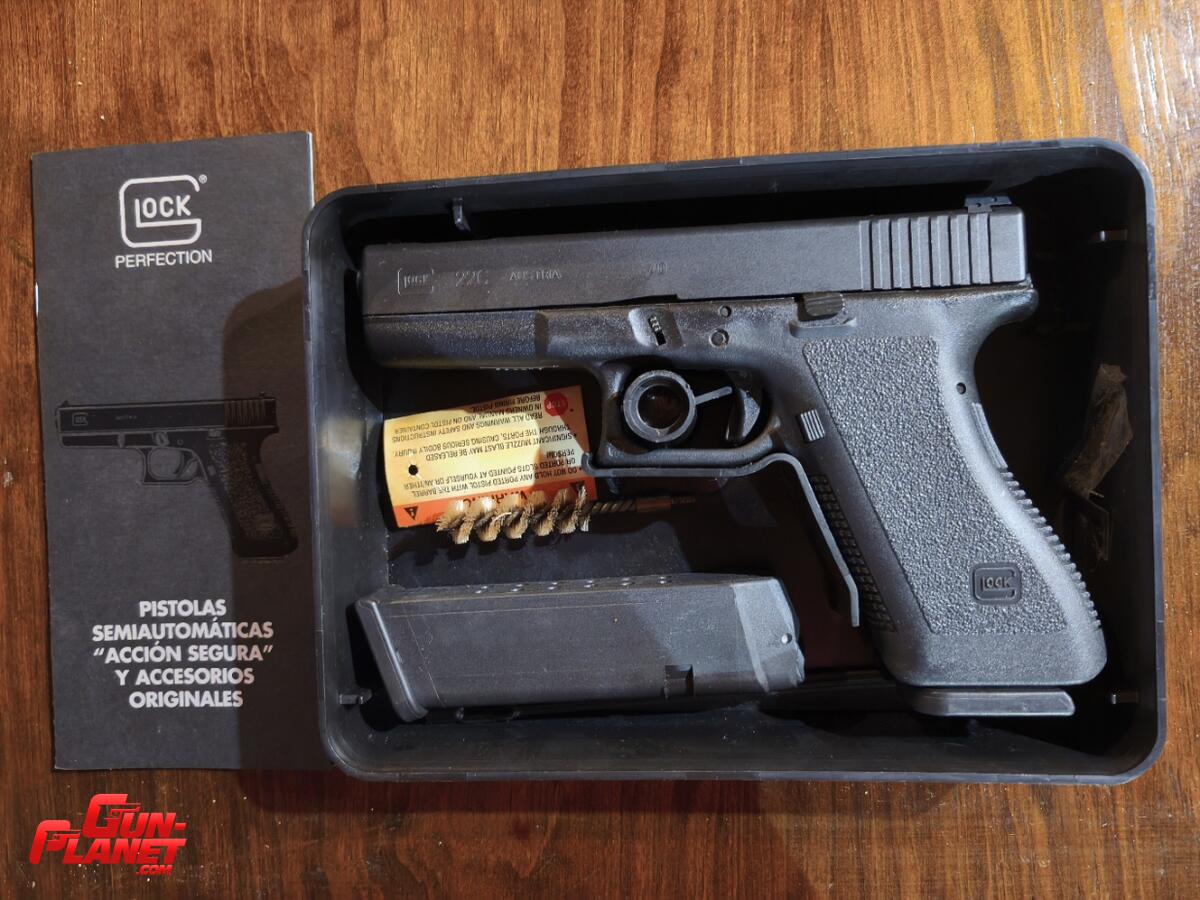 >> Esta mal l modelo, como marca en la foto es 22 C. Las pistolas Glock designadas con una "C" después del número del modelo disponen de dos ranuras en la corredera y en el cañón para compensar la elevación del cañón al disparar.