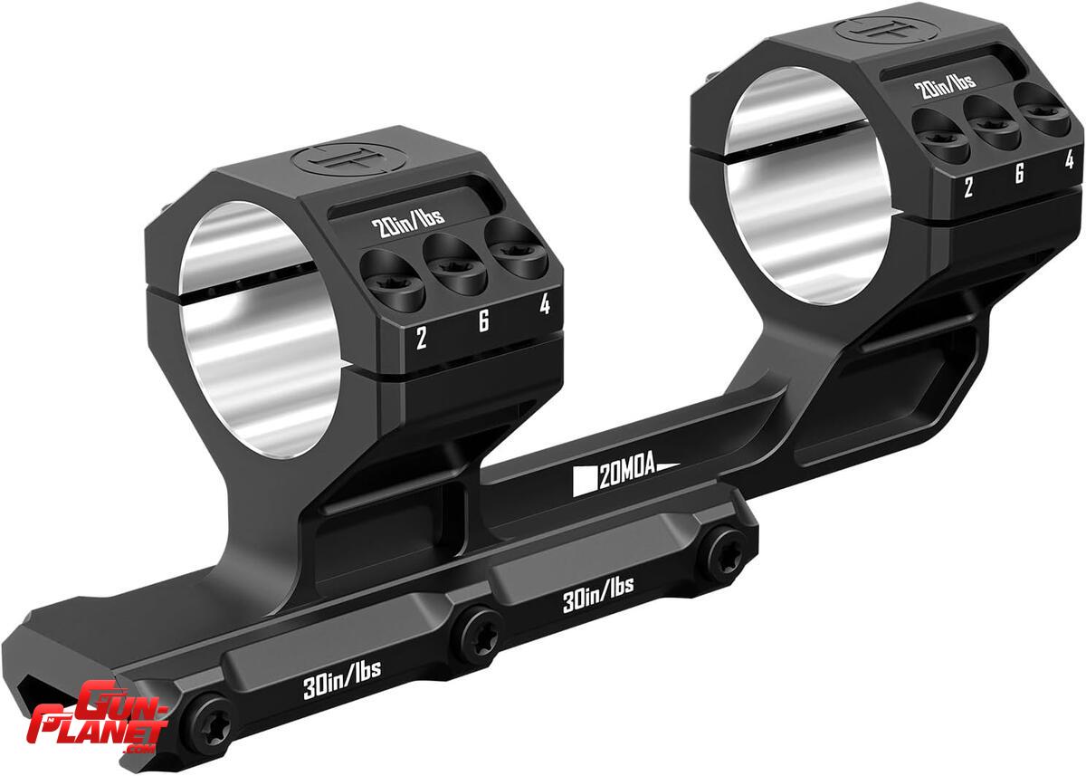 Anillas monopieza para miras telescópicas de calidad premium para tubo de 34 mm con inclinación integrada de 20 MOA (aprox. 5,8 mrad). Esta pendiente genera un valioso rango adicional de ajuste vertical en la retícula, permitiendo compensar la caída de bala a distancias extremas sin “topar” las torretas de elevación.