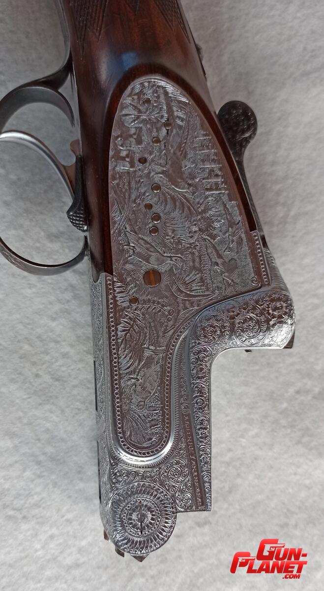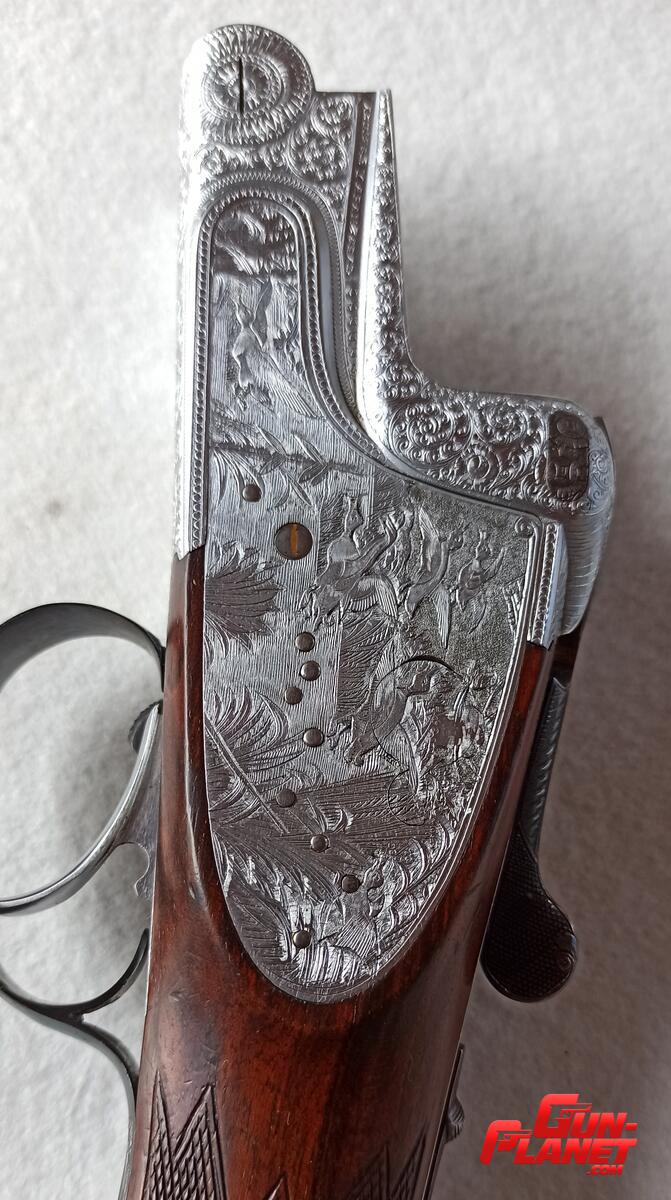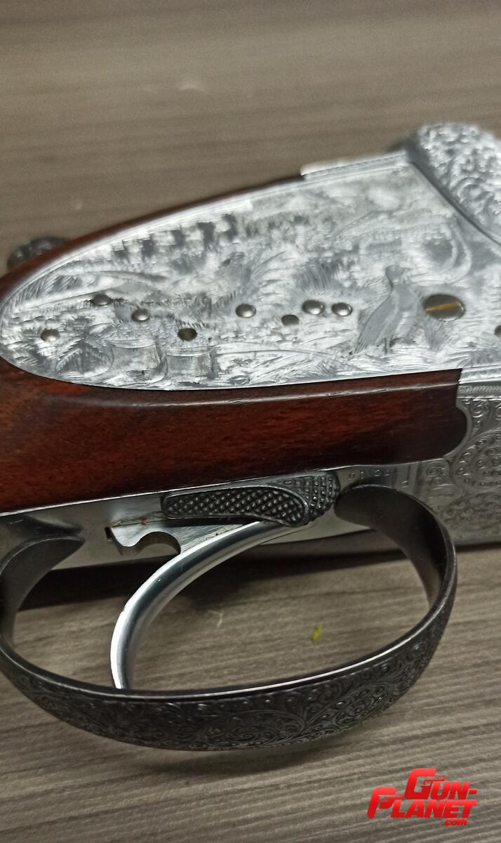 Escopeta superpuesta AYA modelo 37-B calibre 12-70, extractor automático, mono gatillo y selector de Tiro, platinas extraíbles con finos grabados de escenas de caza.