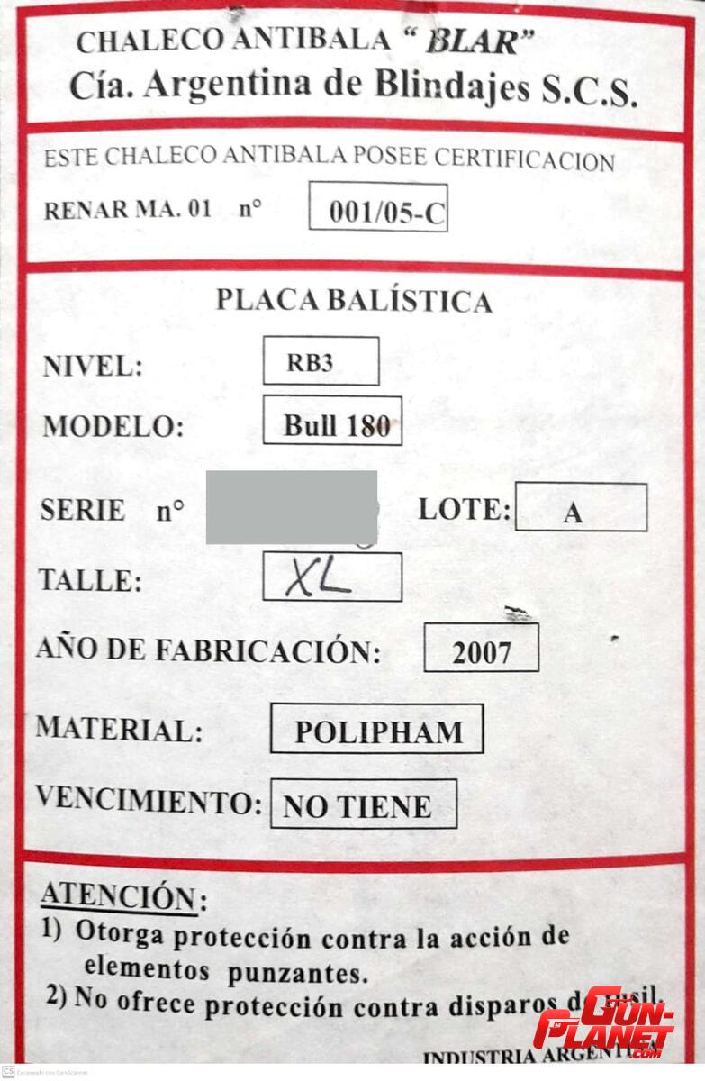 Chaleco de protección Balistica marca Blar, modelo Bull 180, nivel de protección de RB3, talle XL, protección Balistica y Antipuzante, no posee vencimiento, certificación RENAR 001/05-C, placa frontal, posterior y laterales. Se acepta permuta por visor nocturno/térmico.