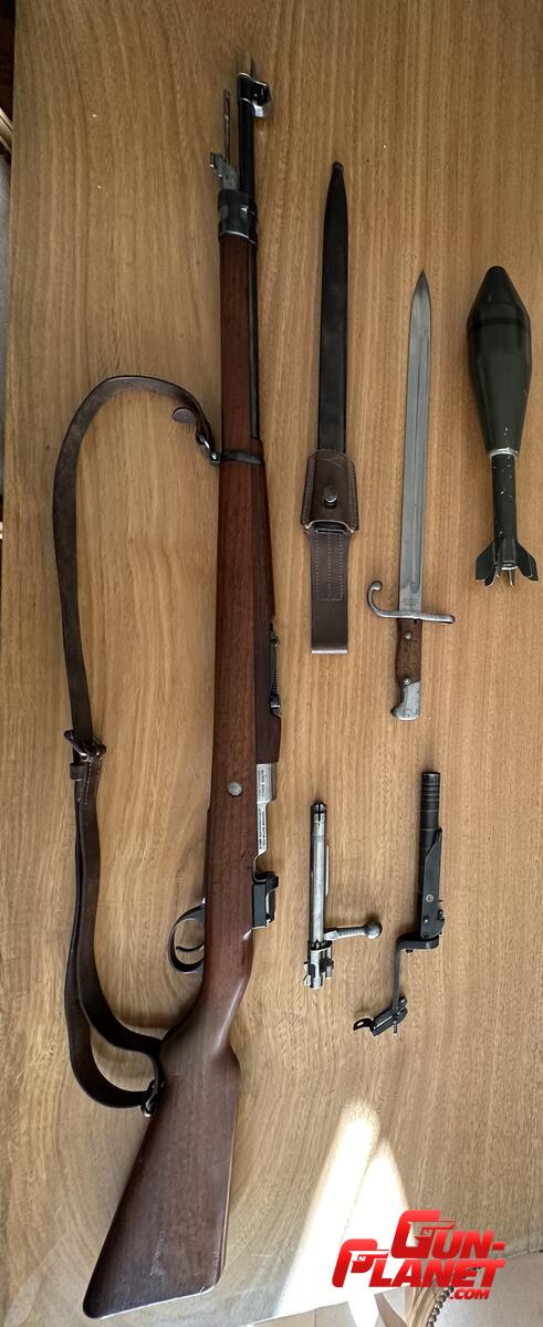 Mauser 1909 en excelentisimo estado (todos sus numeros coincidentes, inclusive el de la baqueta) con bayoneta (coincide su numero con el de su vaina) con su tahali, cartucheras con municion de epoca, lanza grandas y municion (inerte). El mismo cuenta con CUIM.
