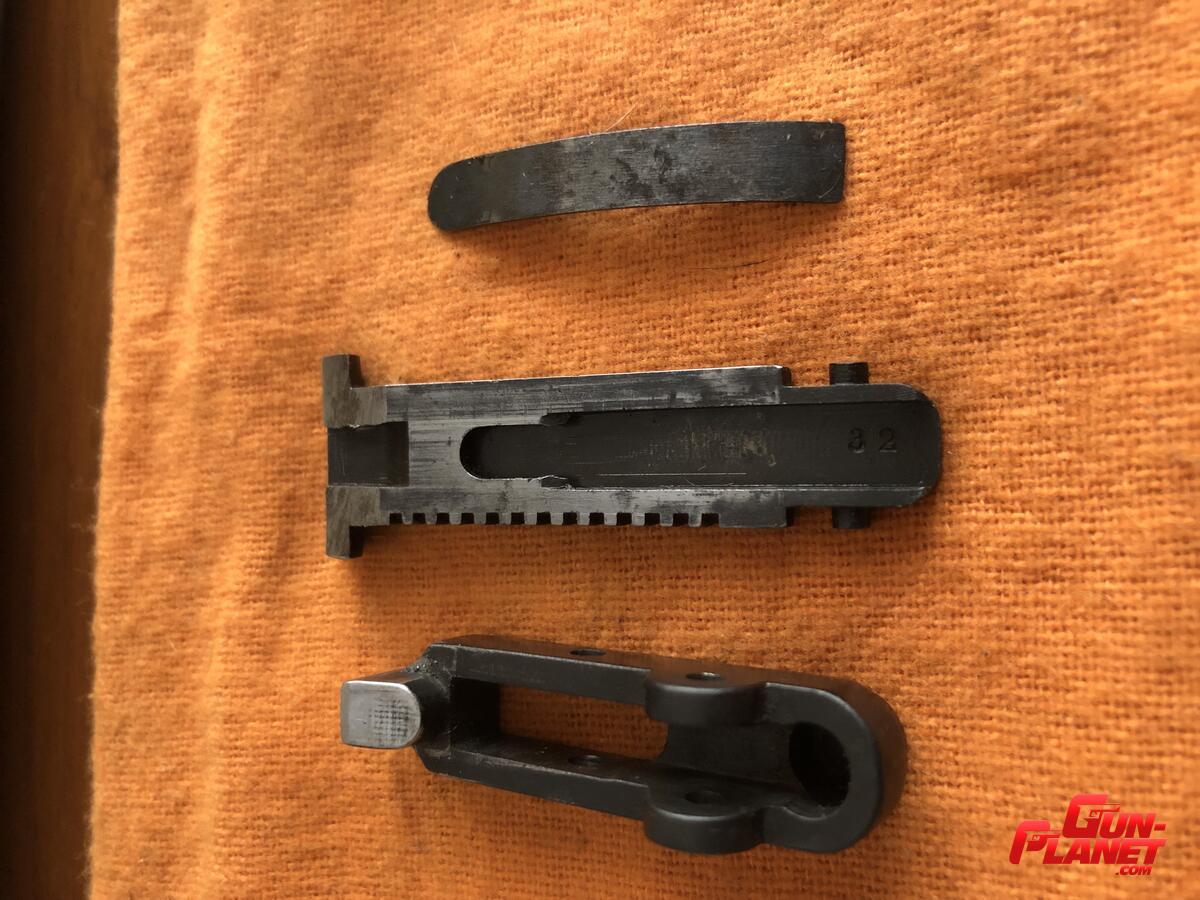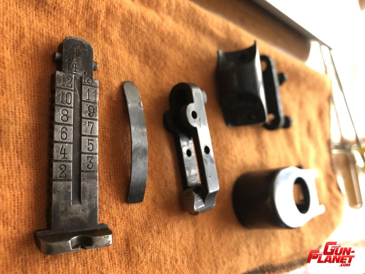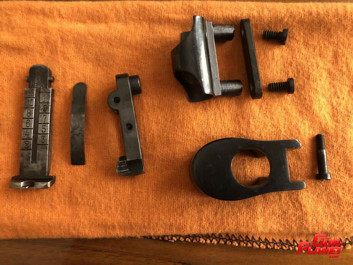 Partes varias de Mauser 1909 caballería. Alza incompleta con muelle, base del disparador, base porta balloneta, y capuchon de culata y cañon. Consulte si quiere partes por separado.