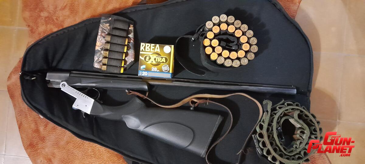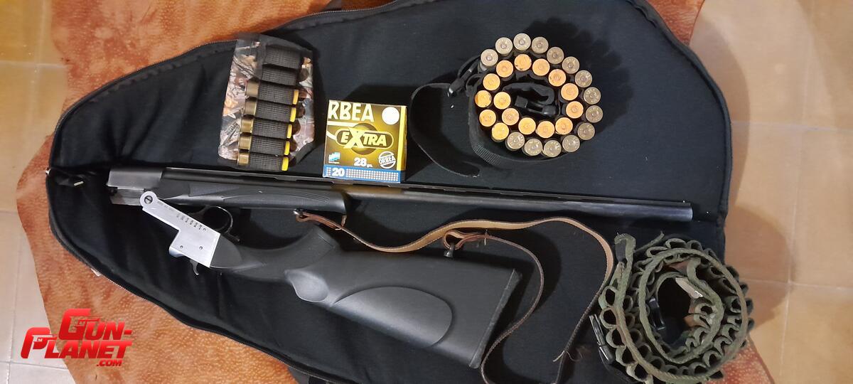 Escopeta de un caño, de un tiro, marca Legend, origen turco, calibre 20, plegable, con correa de cuero, artesanal y funda marca suri.