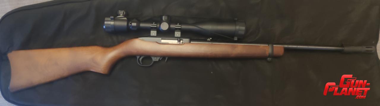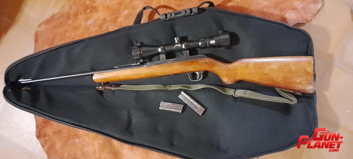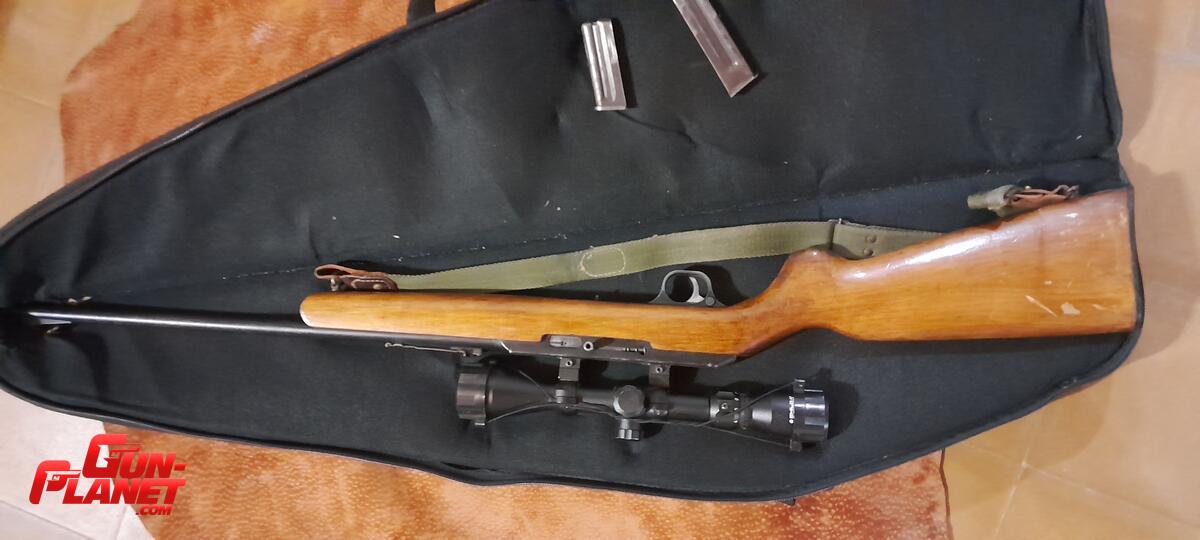 Carabina semiautomática marca FM, calibre 22LR, en exelentes condiciones operativas, mira Shilba Classic 3-9 X 40, correa de transporte, funda acolchada, dos cargadores de 5 y 7 tiros.