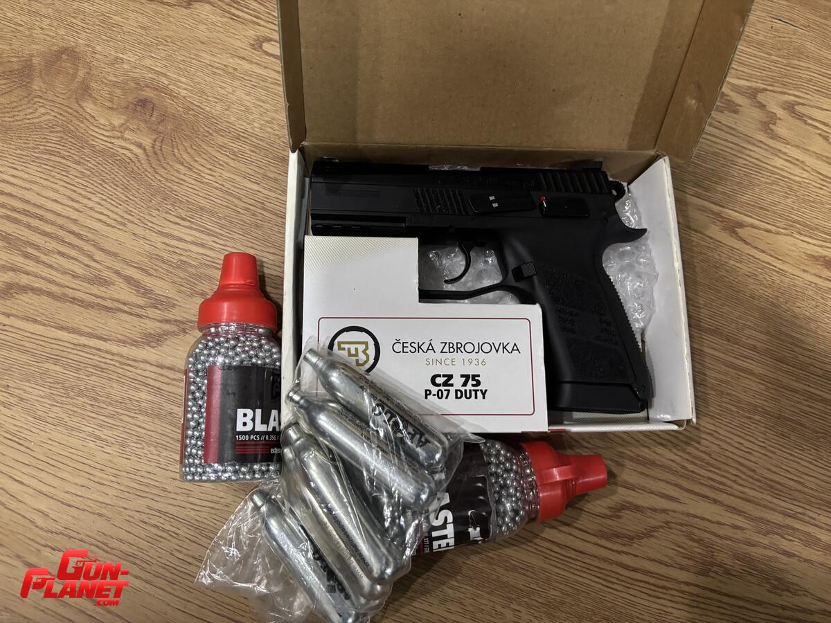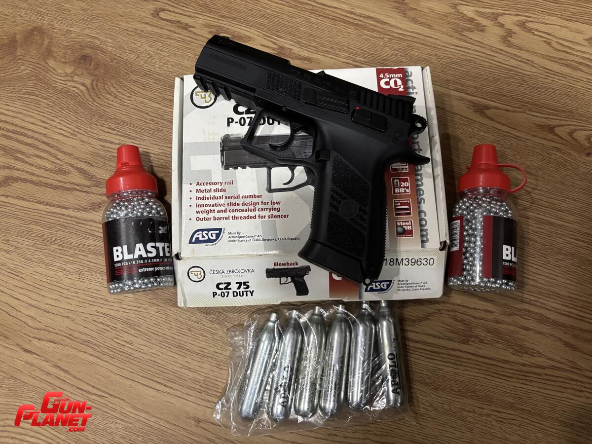 Pistola de CO2 de la marca ASG réplica bajo licencia de CZ 75 P-07 DUTY - Corredera y piezas metálicas - Sistema BLOWBACK - De regalo 3000 balines y 6 garrafas de Co2