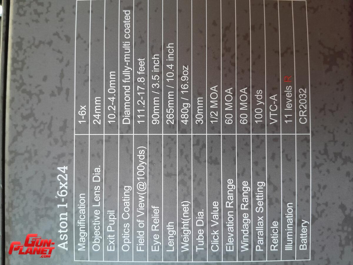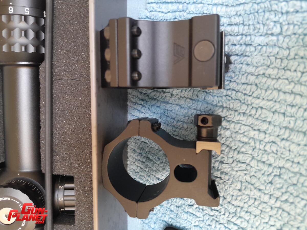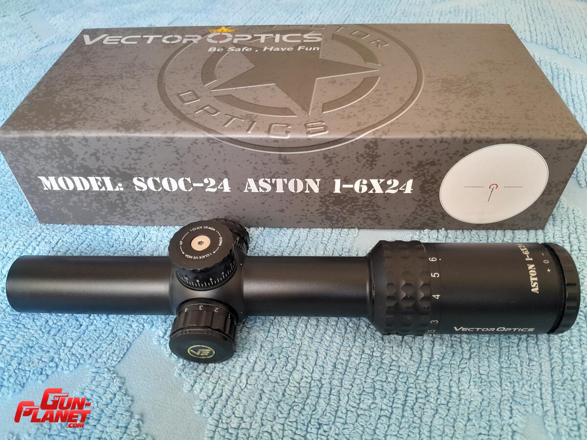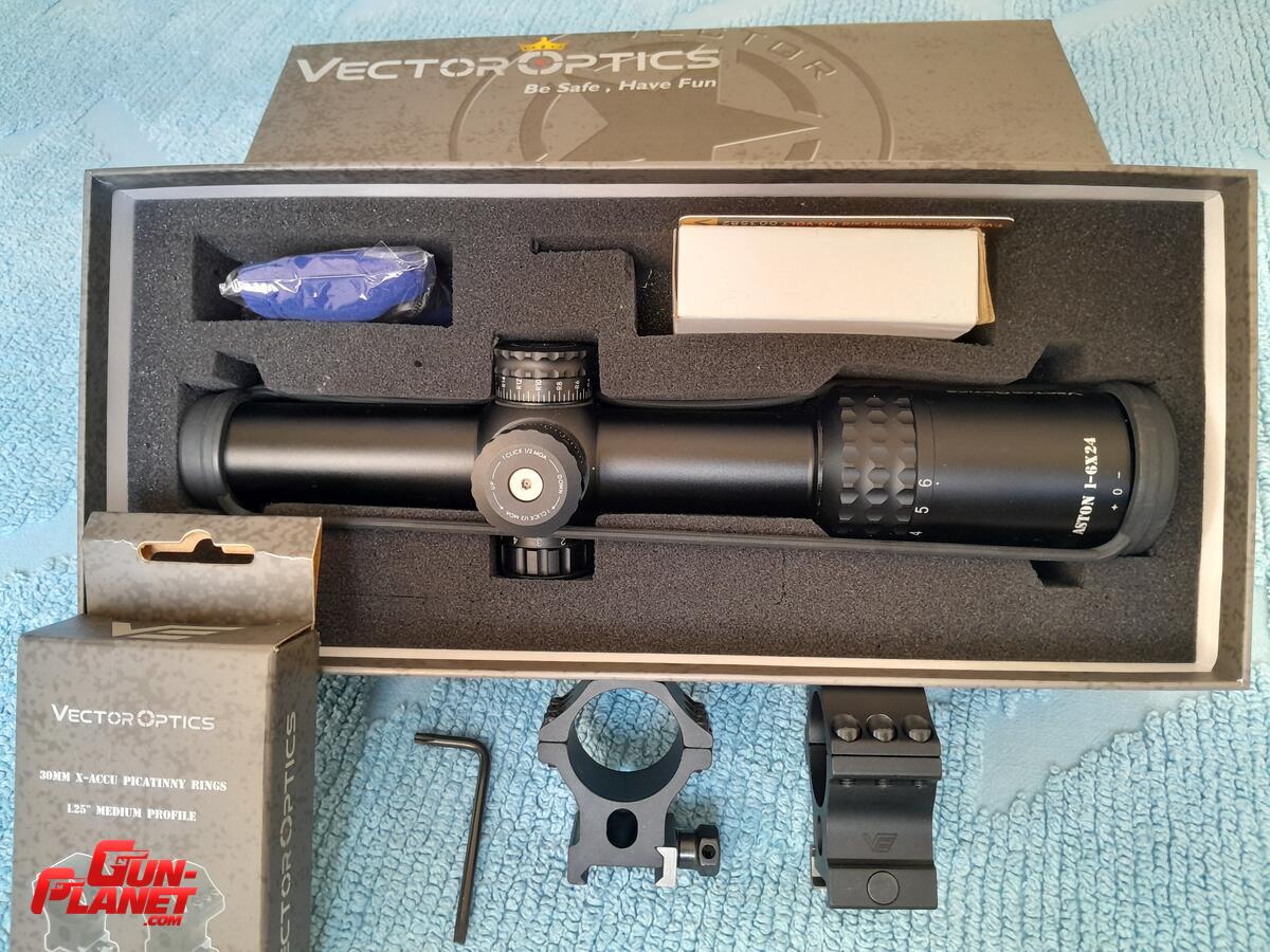 Mira telescópica Táctica. Marca VECTOR OPTICS. Modelo ASTON 1 a 6 aumentos x 24 mm de objetivo. Retículo iluminado rojo de 11 niveles de intensidad. Tubo de 30mm. Juego de anillas VECTOR OPTICS de 30mm. Batería CR2032