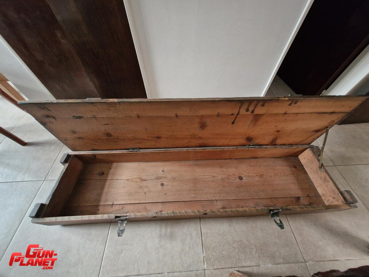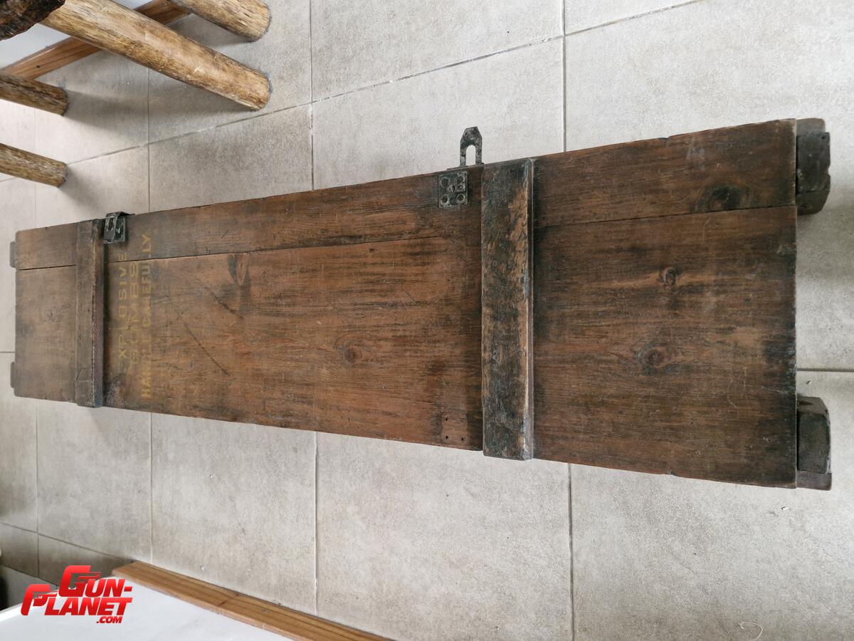 Muy muy raro de ver por acá. Cajón de torpedos "Bangalore" lhttps://aquellasarmasdeguerra.wordpress.com/2014/03/28/el-torpedo-bangalore/), se ve su utilización al principio de "Rescatando al Soldado Ryan", año 1944, americano original como se ve en las fotos, con excepción de las bisagras y de las perforaciones para fijarle patas evidentemente (v. Fotos).