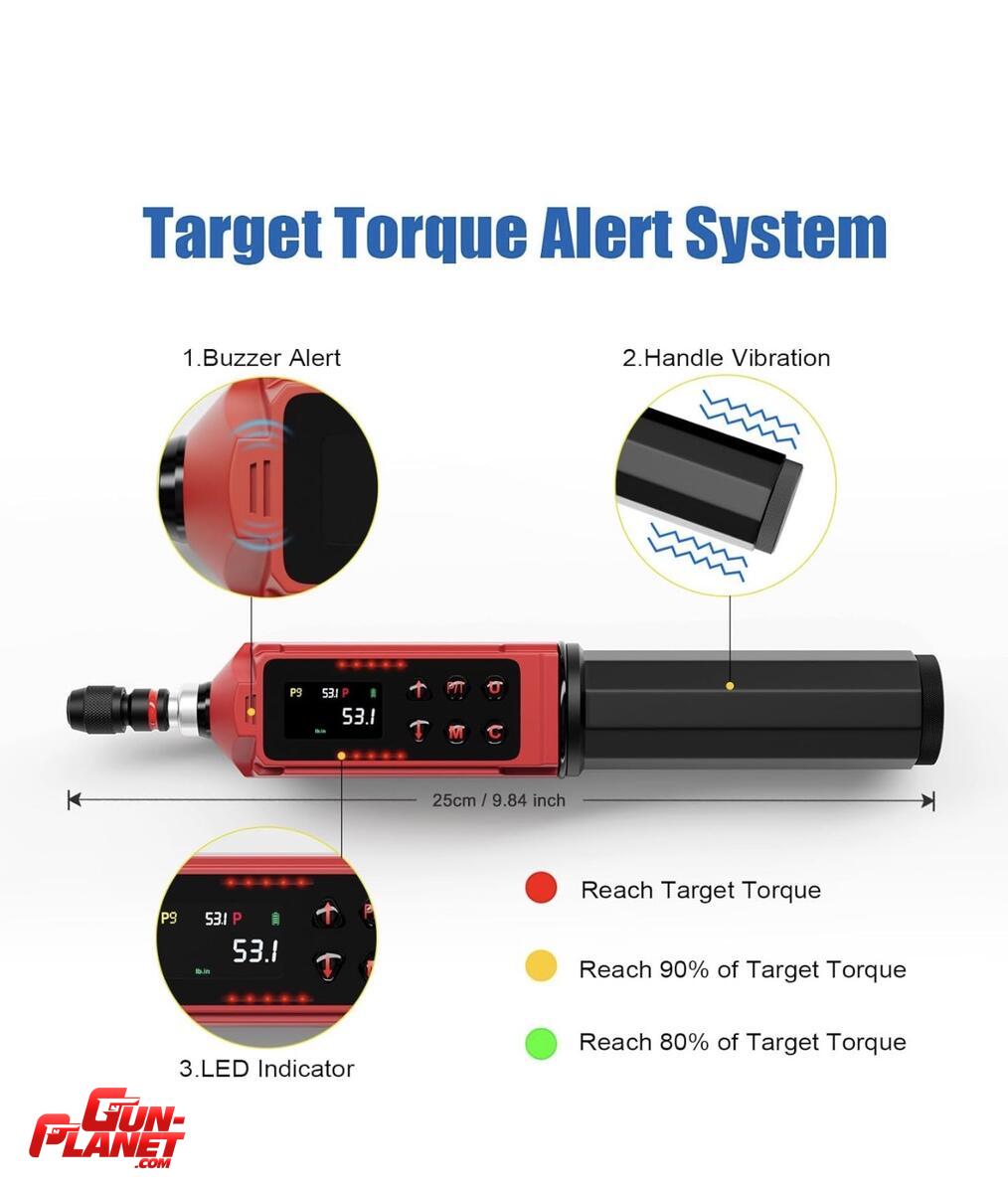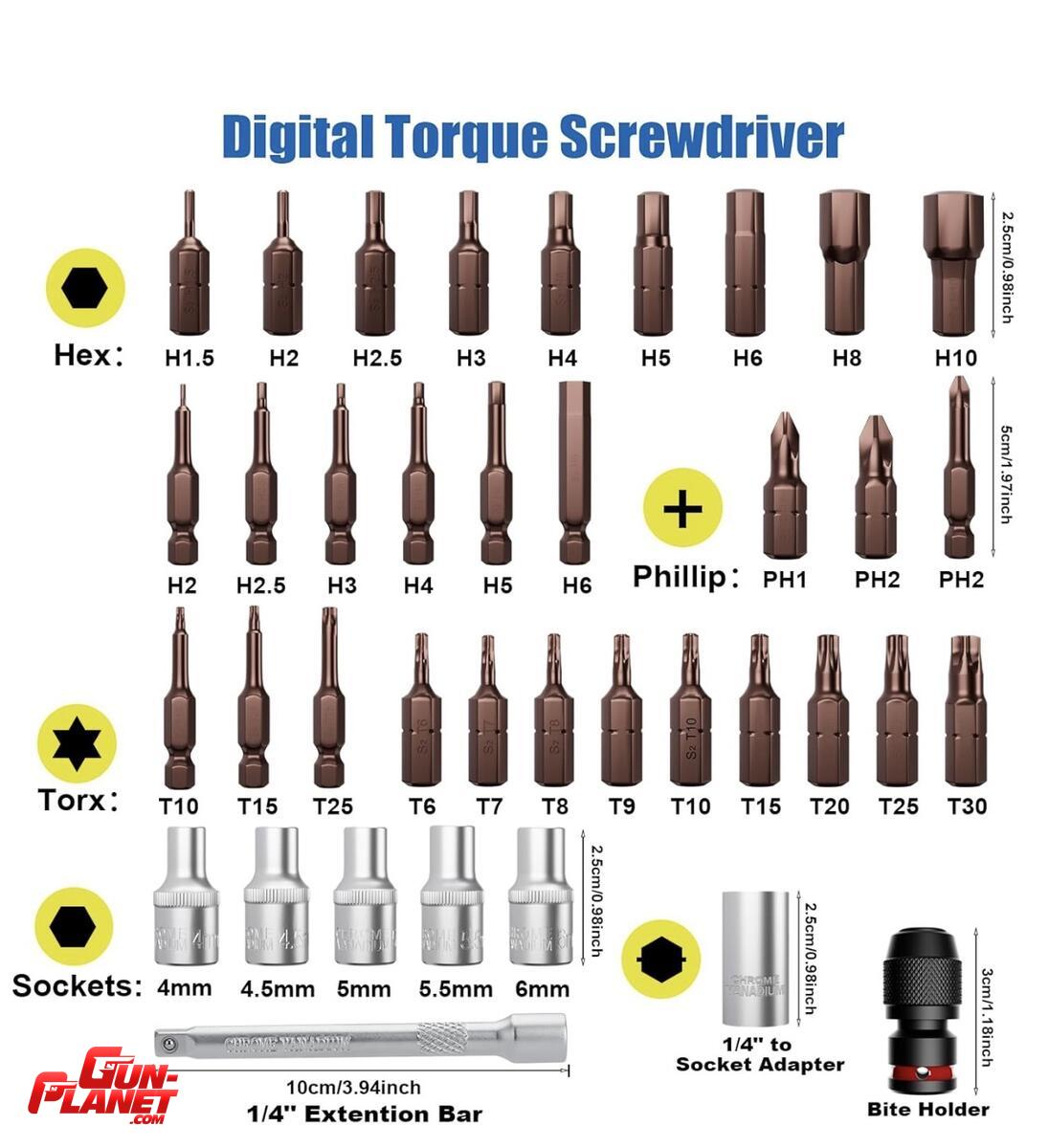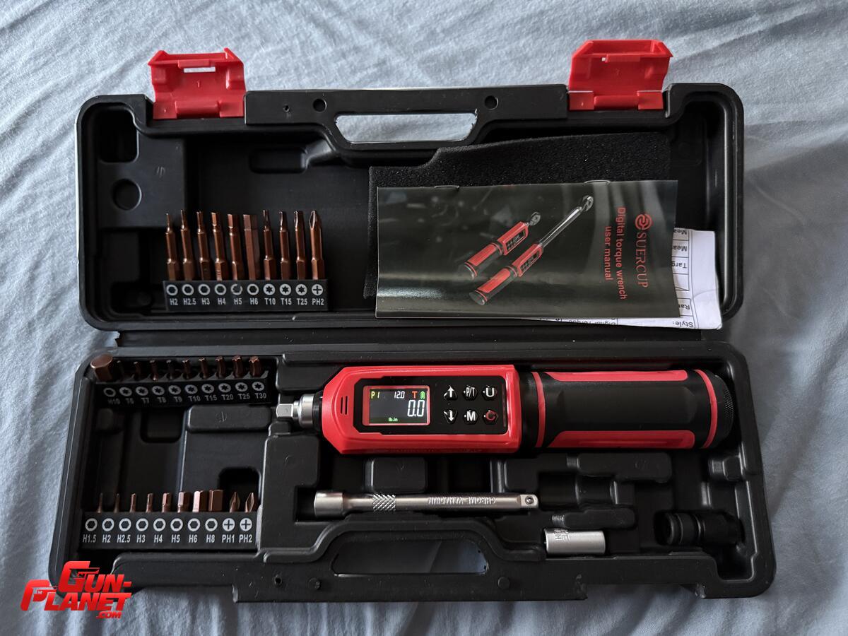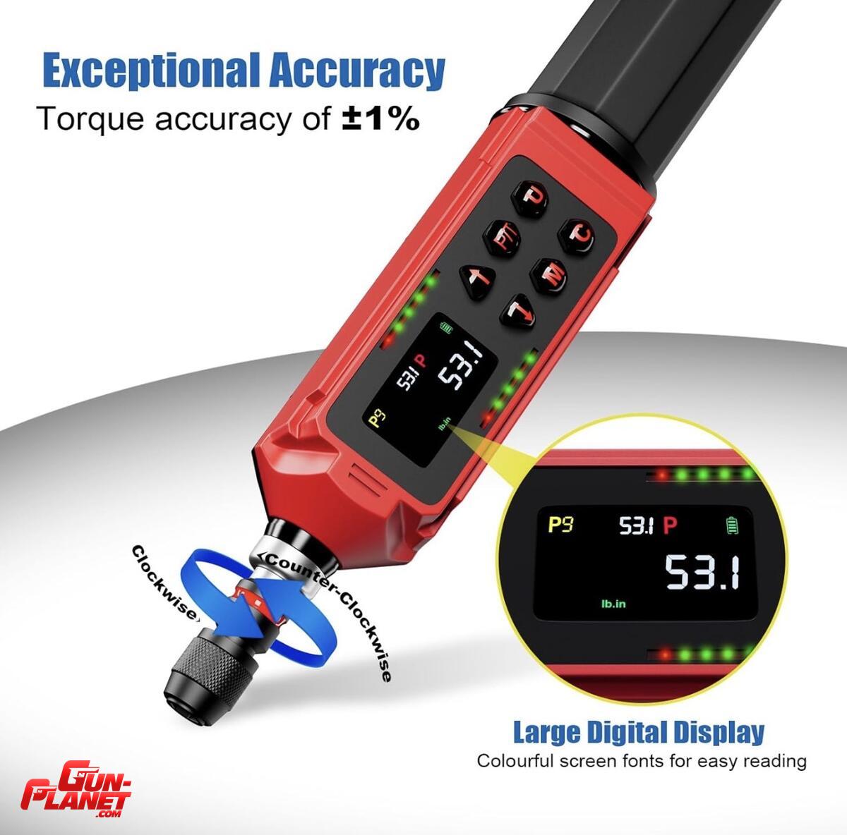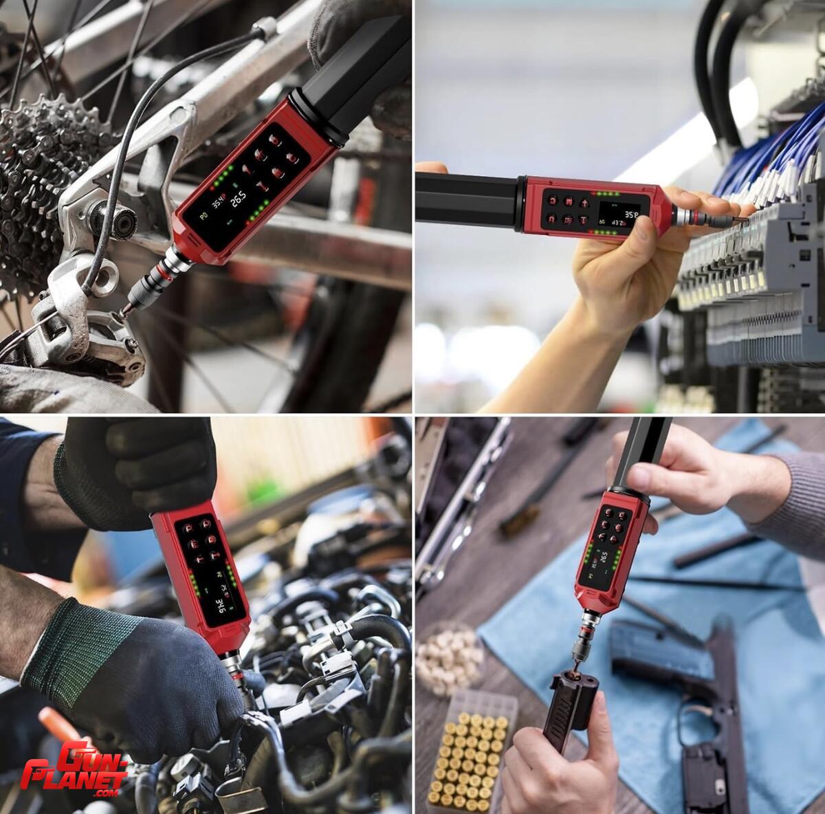 Destornillador con torque digital para ajustar tornillos de armas o tornillos de red dot con torque específico.