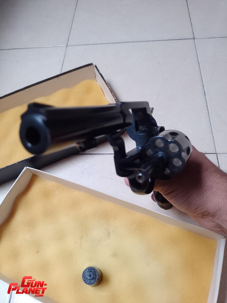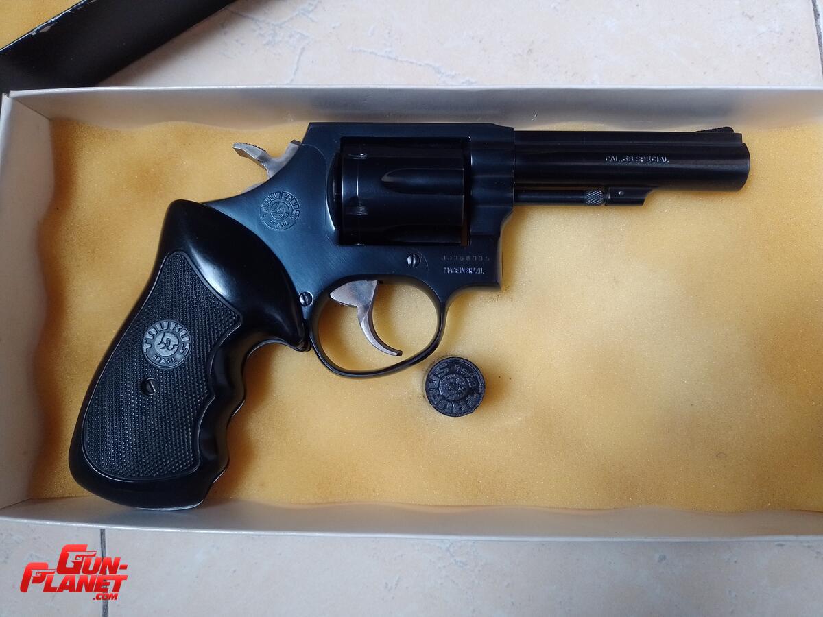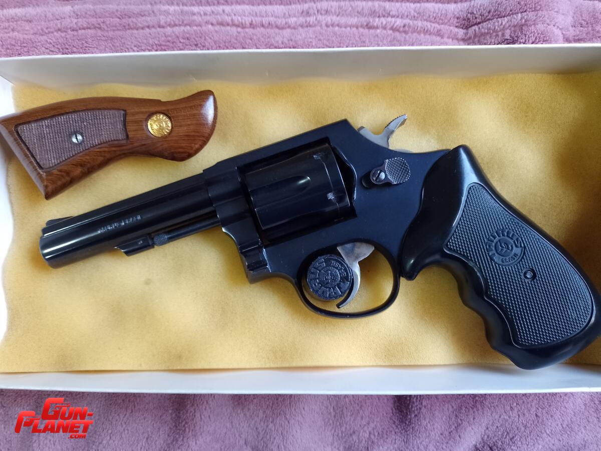 Revolver Taurus cal 38 spl., Mod. 82, 6 tiros, Cañón 4 pulgadas. Década del 90. Impecable, sin detalles. Cachas de madera y de goma (ambas originales de Taurus)