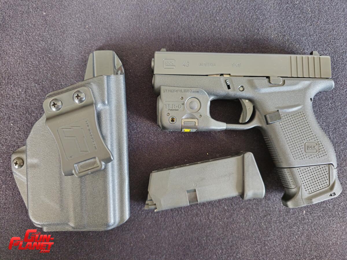 Pistola Glock 43 como nueva, capacidad estándar 6+1. Tienen cargador extendido +2. Mira laser y linterna marca Streamlight. Canana de Kydex inside the pant. Miras de tritio.