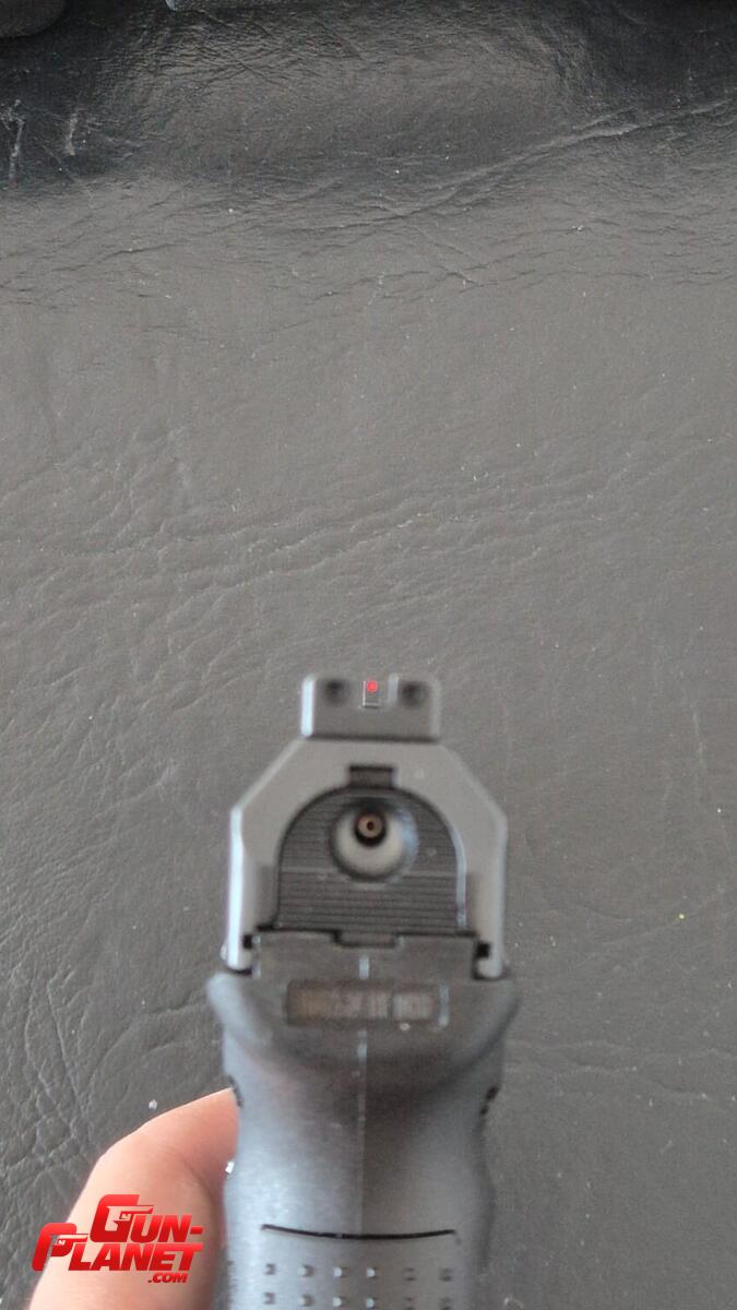Y mejorada con mira de fibra optica marca canik y le pinte de negro los 2 puntos blancos traseros con un Sharpie. Facil y efectivo.