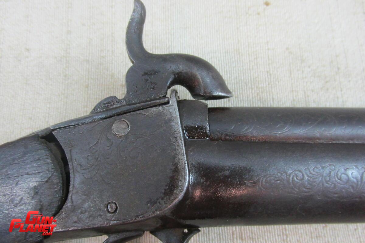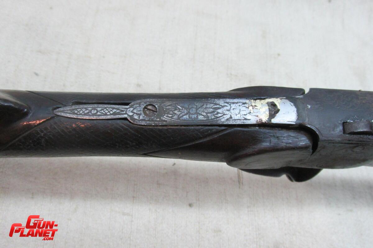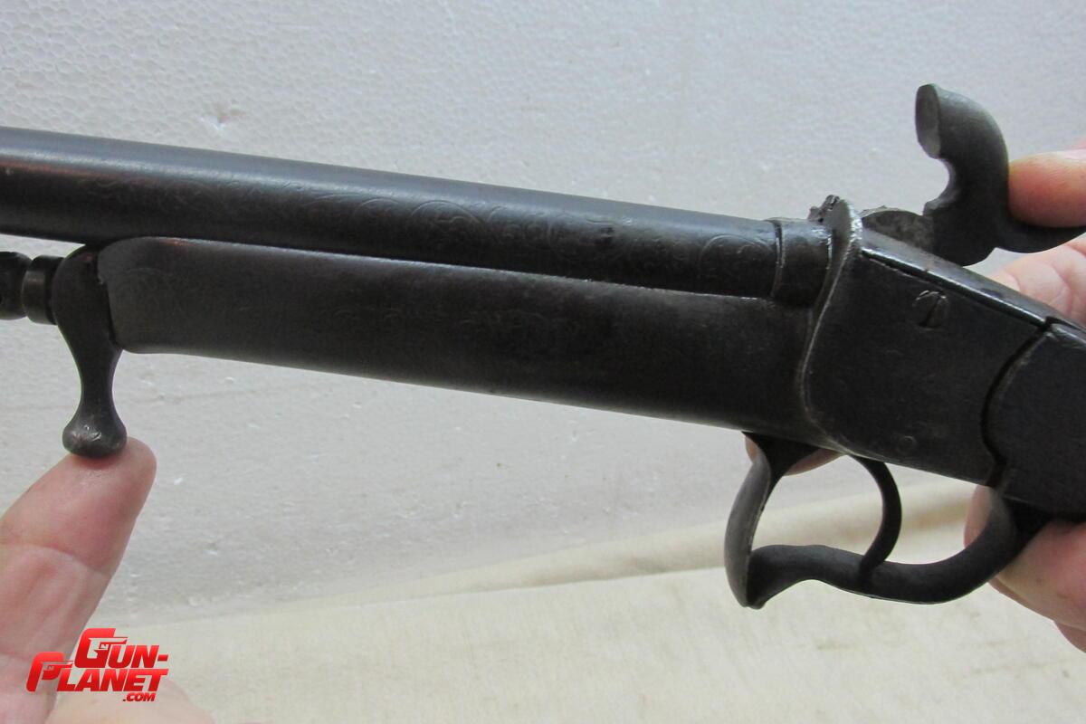 lefaucheux de 1860 Con sistiema de carga unico deslizamiento de caño en el cajon de mecanismo Tipo trombon marcajes varios semi visibles. en el caño E. Paris . Calle Rivadavia 20 . Buenos Ayres. ( el importador). Se encuentra operable con patina original con laca y sin polillas ni faltantes.