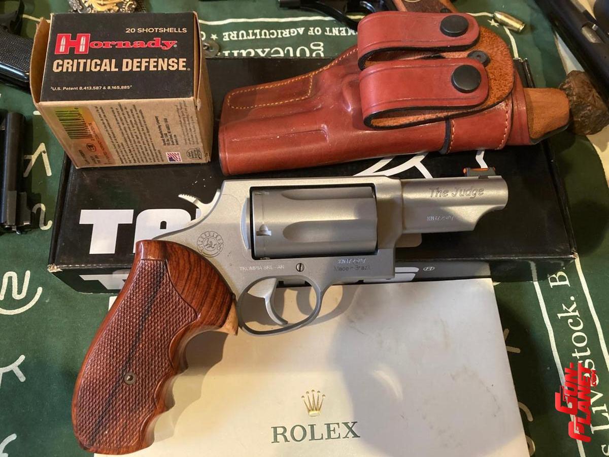 Taurus judge(45 long colt, .410) unica mano sin uso.Es una escopeta de mano, con el cartucho .410 de hornady critical defense cada disparo expulsa una punta FTX de 10mm y 2 bolas de 9mm .Es decir con un tambor de 5 cartuchos , serian 15 disparos.Por tal motivo , menos de 3 pulgadas de cañon es ingobernable con estos cartuchos.Fue tan existoso en EEUU (aunque en algunos estados como California esta prohibido por el potencial daño) que Smith and Wesson lo copio con el GOVERNOR .El revolver esta inmaculado, con cachas de madera (nogal) hechas a medida, funda de cuero tambien realizada a medida.Caja, manuales, llave, etc-.Slds.Gracias