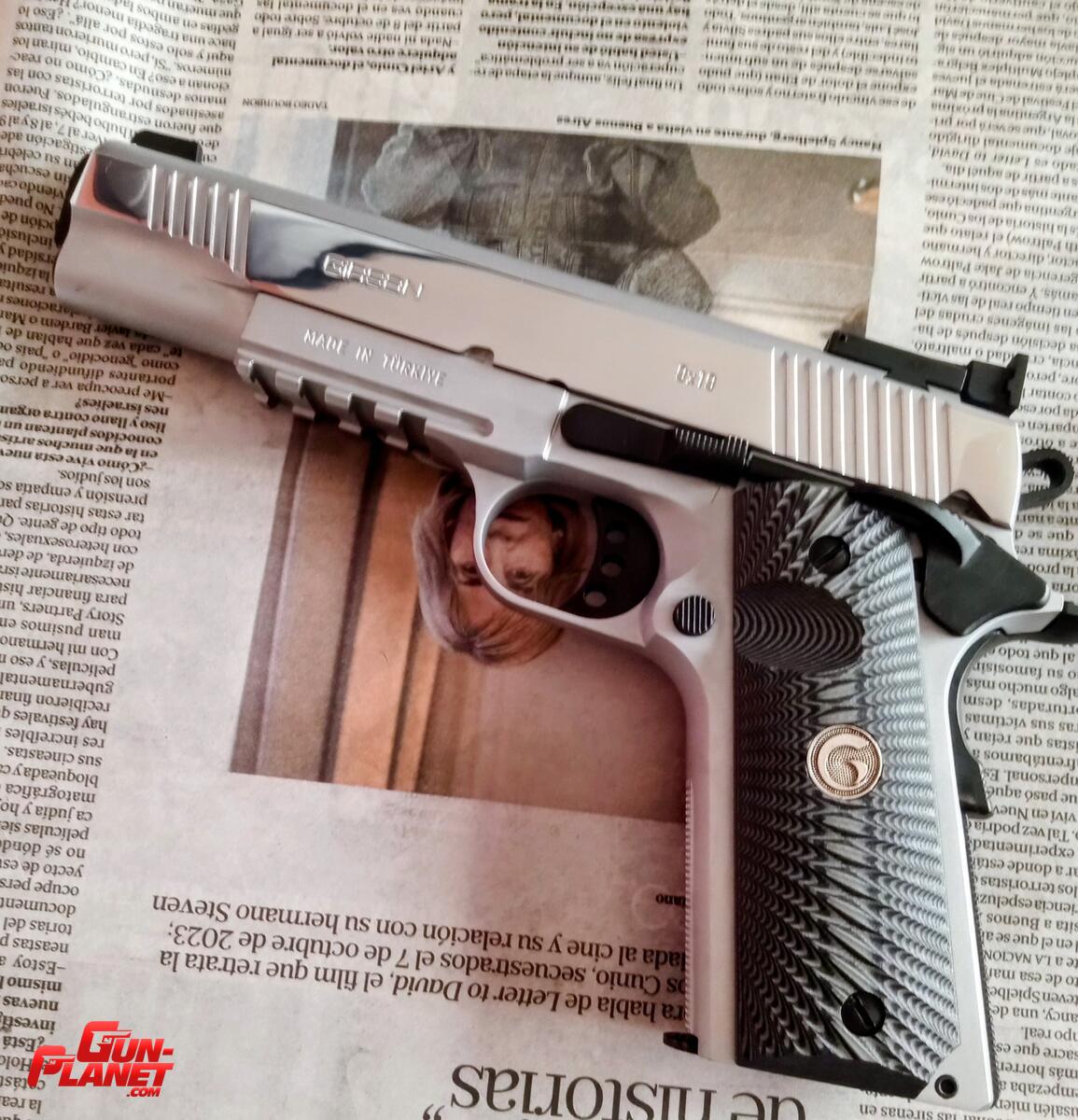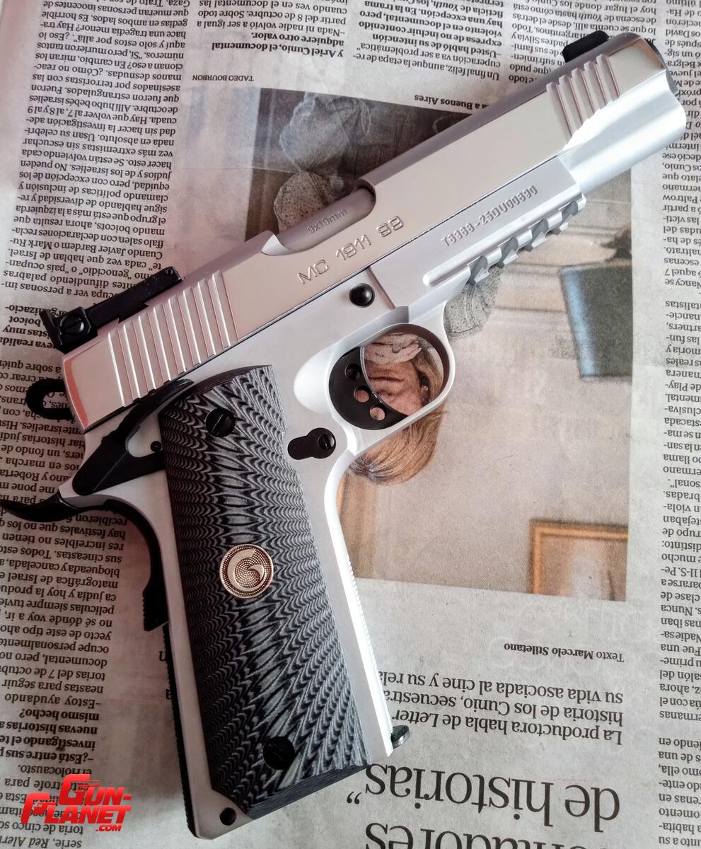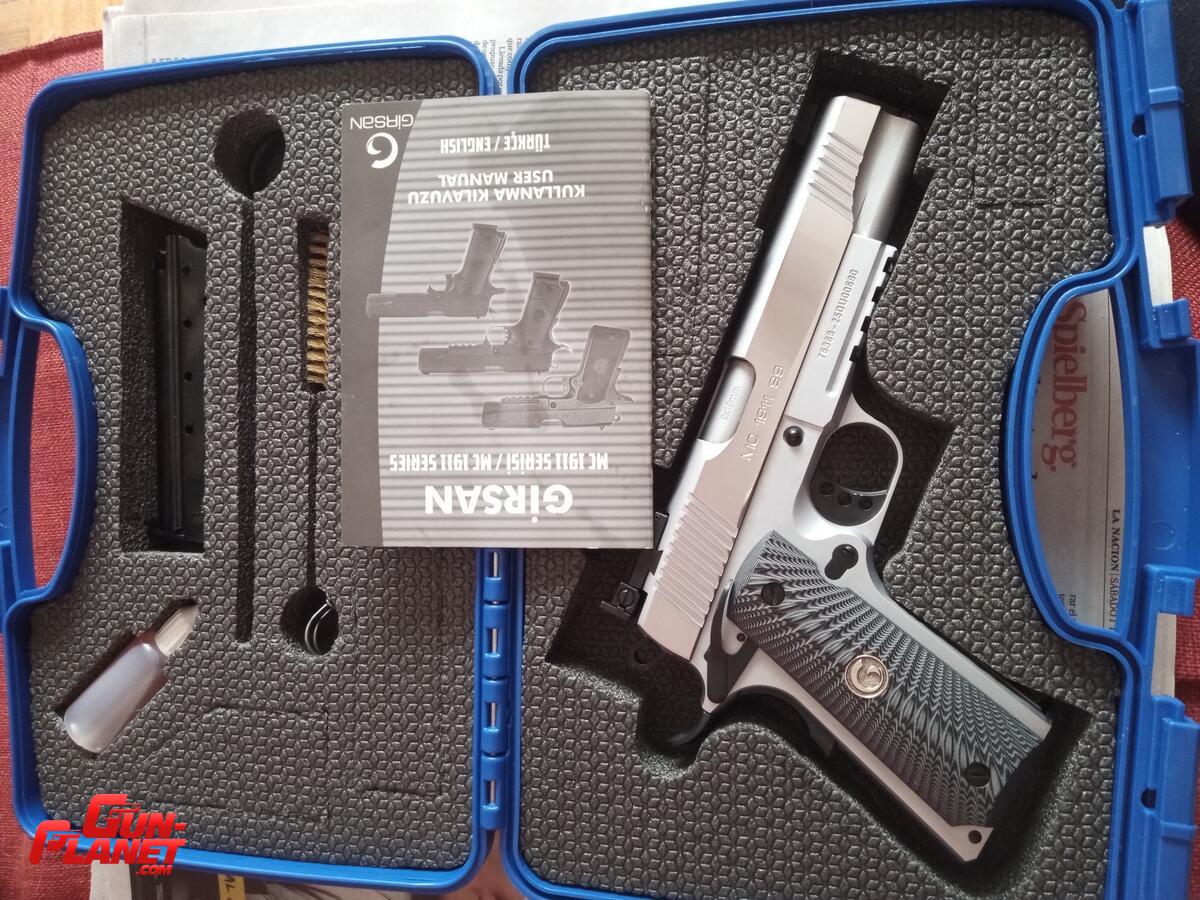 Pistola Semiautomática Grisan 9mm modelo MC1911 SS9. Seguro extendido ambidiestro, mira tipo Bo-Mar, guión target, guía extendida, boquilla Mach, Grip tipo G3, dos cargadores Mec-gar italiano. Solo probada, no tiro más de 150 disparos Magtech de 147 y 124 en el polígono Centenario. La tomé en parte de pago en una armería por un fusil Browning a-bolt que vendí. Valor 1050 dólares cabeza grande.