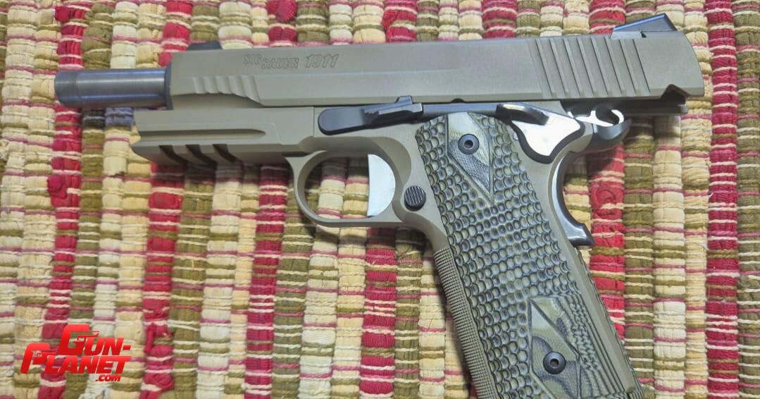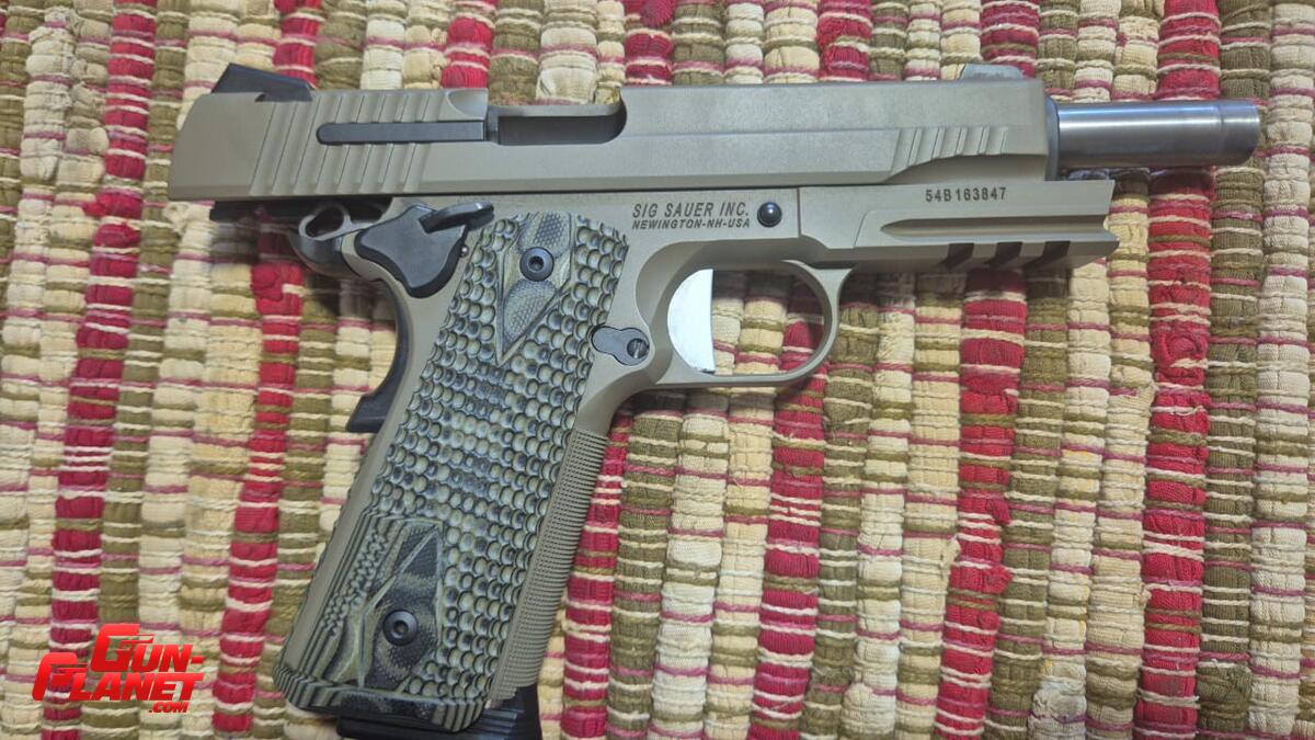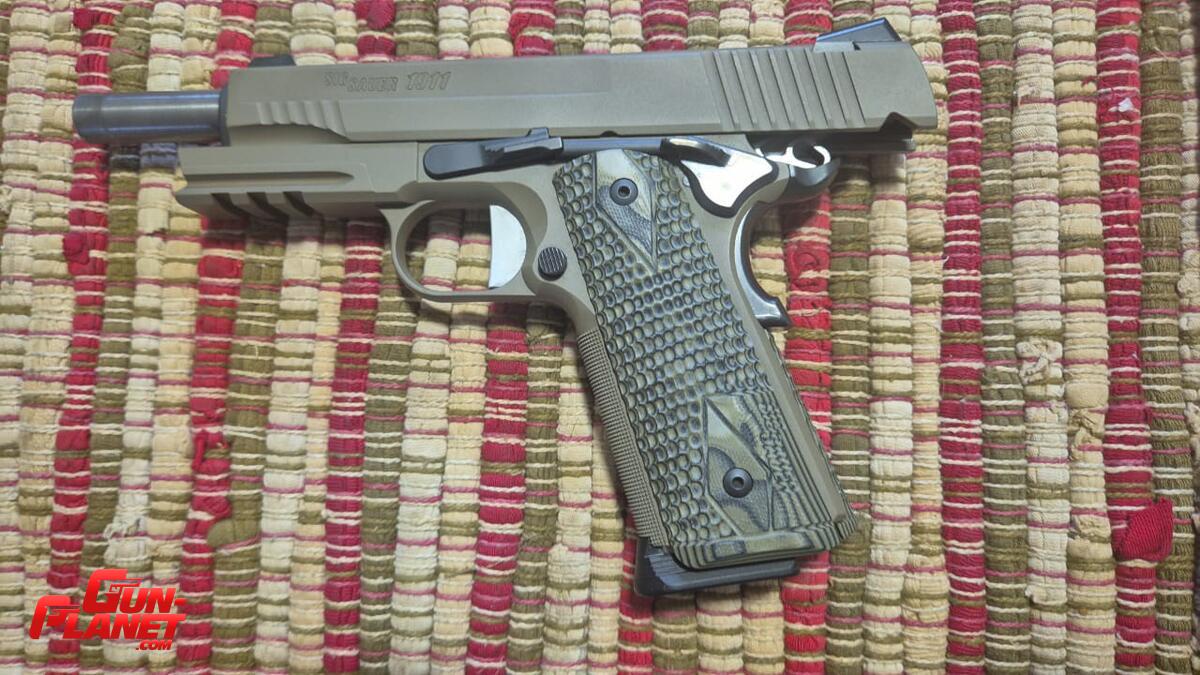 Pistola Semiautomática Sig Sauer 1911 cal 45 ACP modelo Skorpion. Cerakote verde,Grip tipo escama de pescado o cocodrilo, muy adherentes, embudo, manual, caja original, dos cargadores. Solo probada.