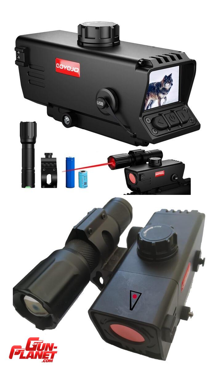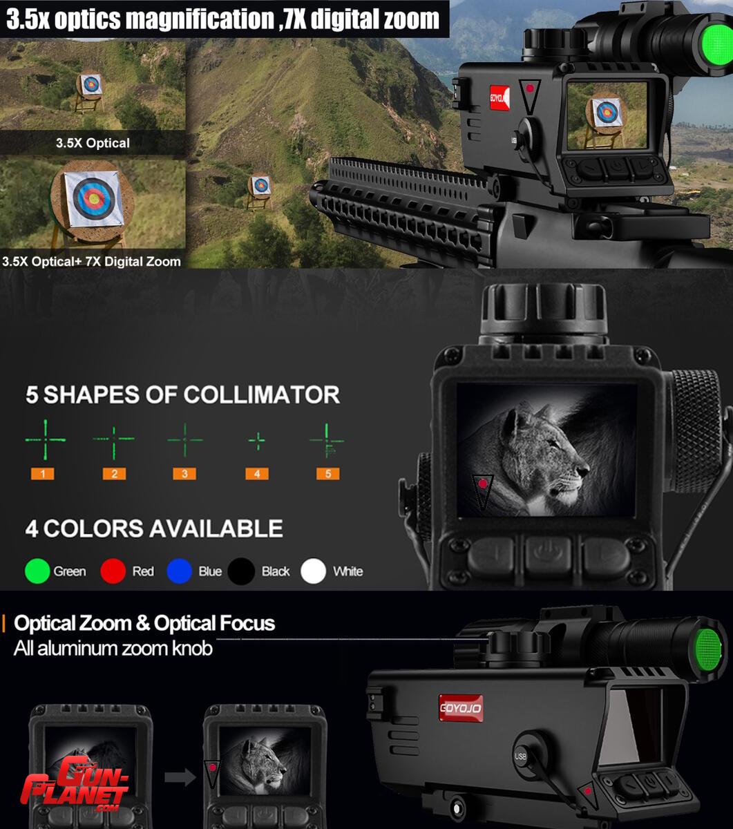 Incluye: visor y adaptador riel 22mm (acople rápido) / linterna y soporte / 2 baterías (1 linterna y 1 visor) / cable usb (carga / video), correa muñeca, manual.