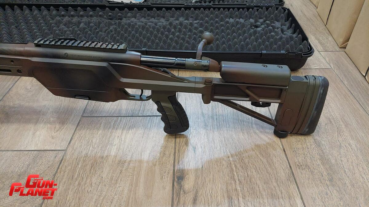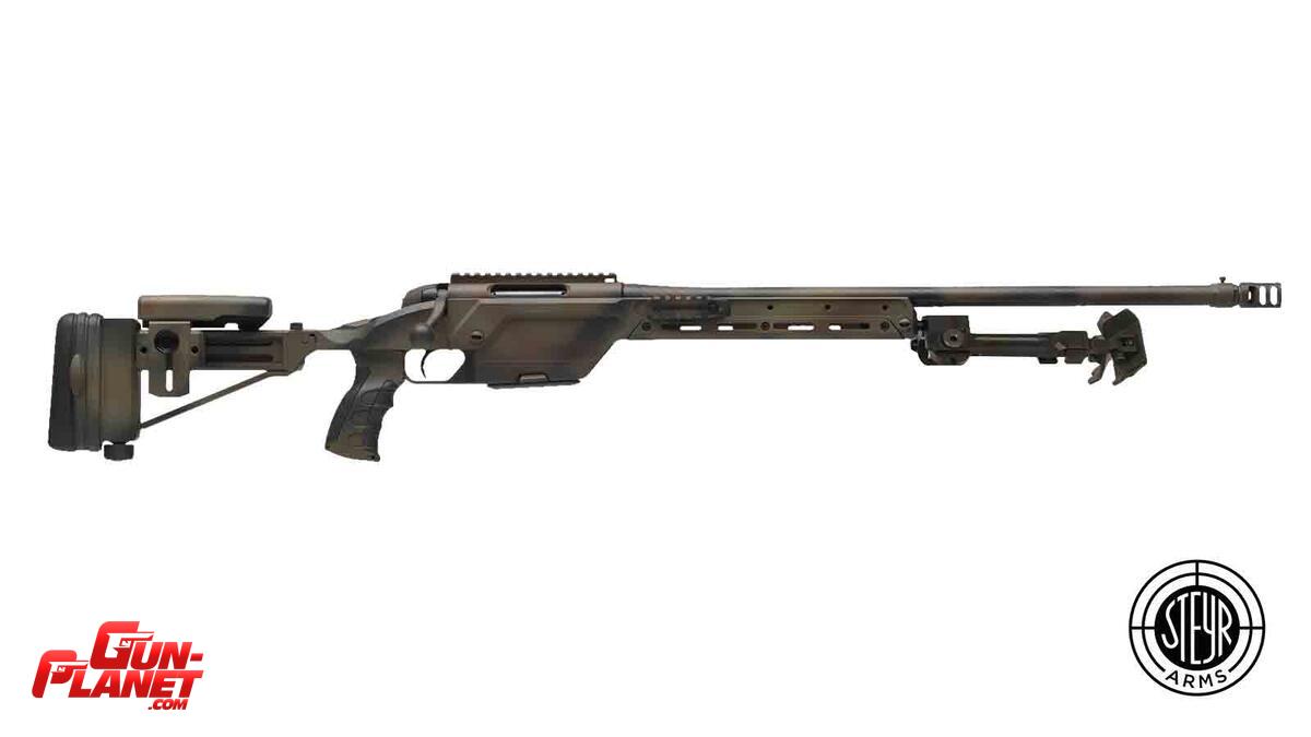Espectacular fusil Steyr Mannlicher modelo SSG 08 terminación camo calibre .338 Lapua Magnum, nuevo sin disparar, en su estuche plástico de serie.