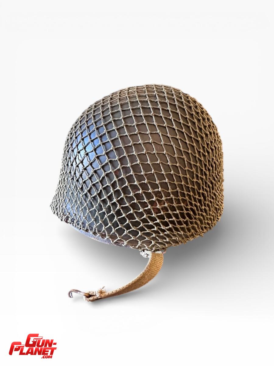 CASCO M1 ,PRIMERA PRODUCCION 1941/1943 ORIGINAL US WWII MODELO SWIVEL BAIL ,VERDE OLIVA ORIGINAL, CHINSTRAP ORIGINAL ,FRONT SEAM,Y RED DE CAMUFLAJE M1944