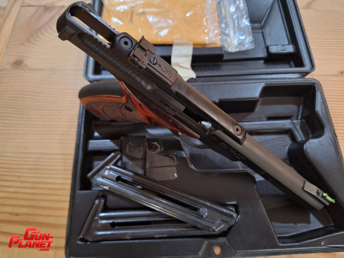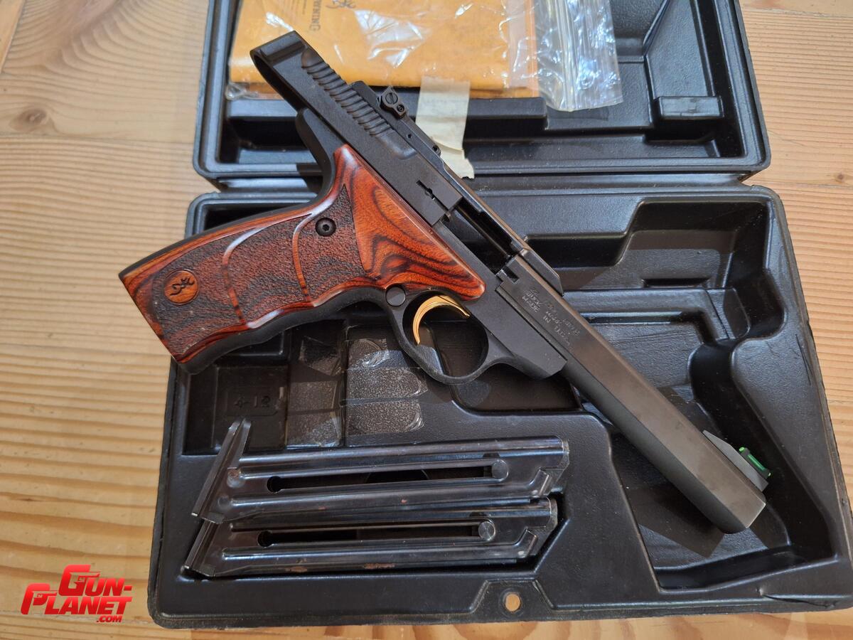 Vendo pistola Browning Buck Mack, cal 22 plg, excelente esto muy pocos disparos, caja original, manual, dos cargadores mira de fibra, cachas de nogal, y riel picatiny original