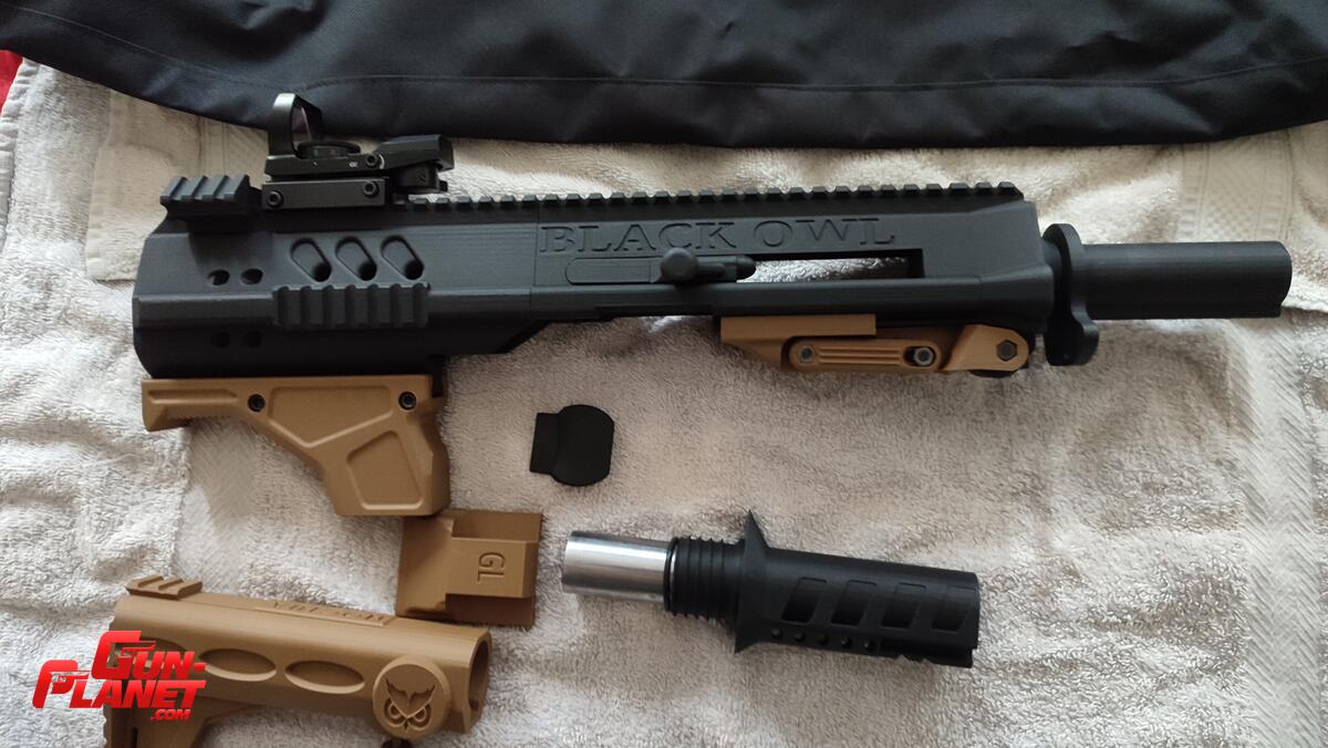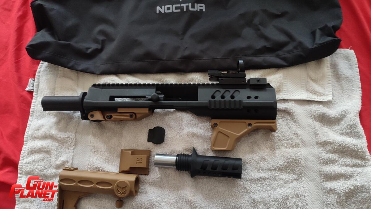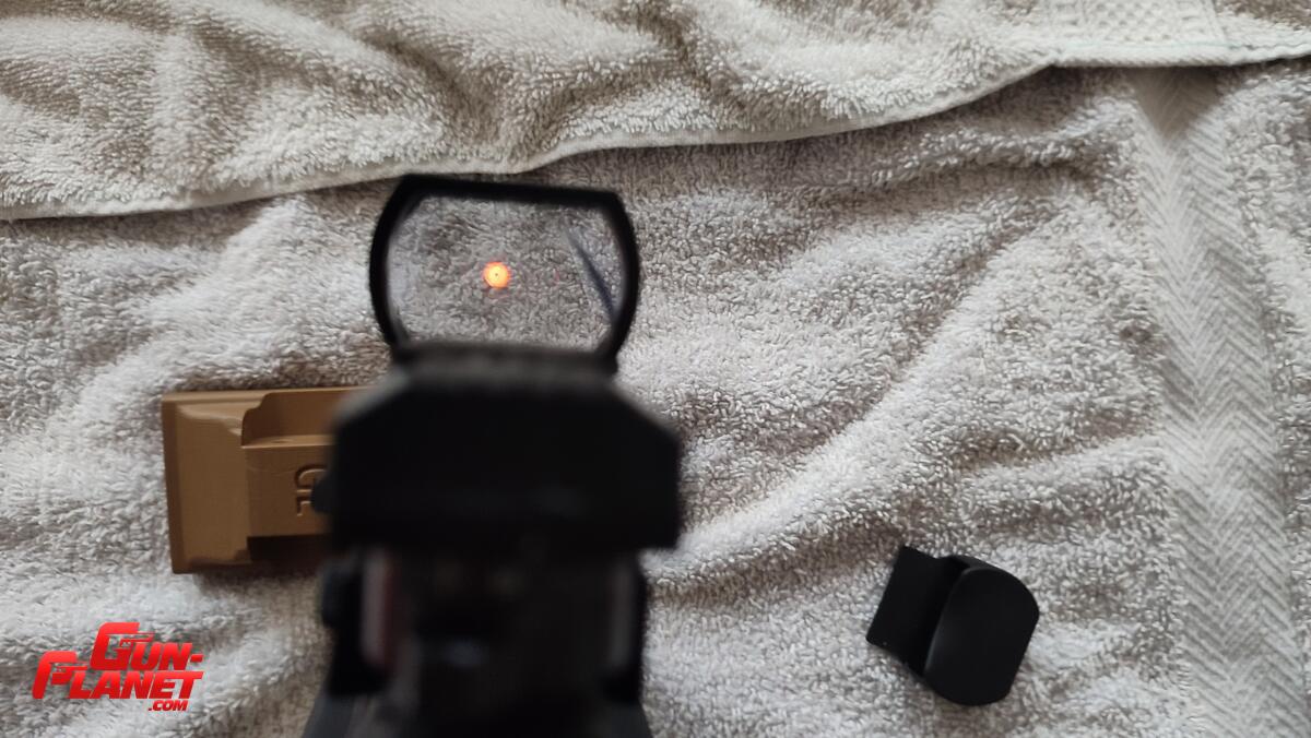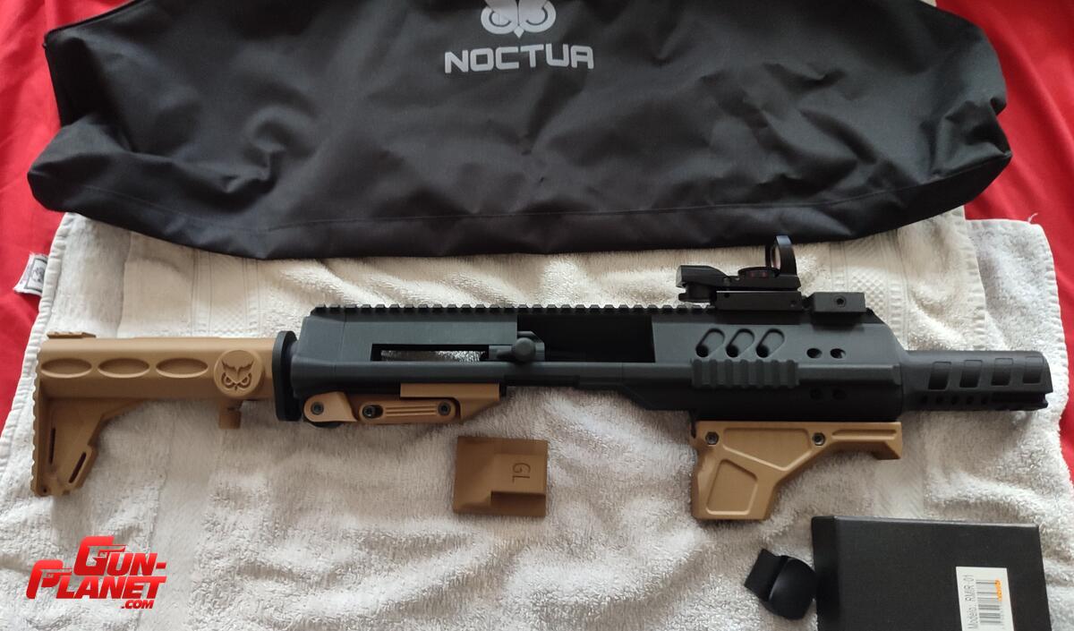 Con mira holográfica reticulos en rojo y verde.( rajada en una esquina que no afecta su funcionamiento) Viene en su bolso con cierre para facil traslado armado o desarmado.