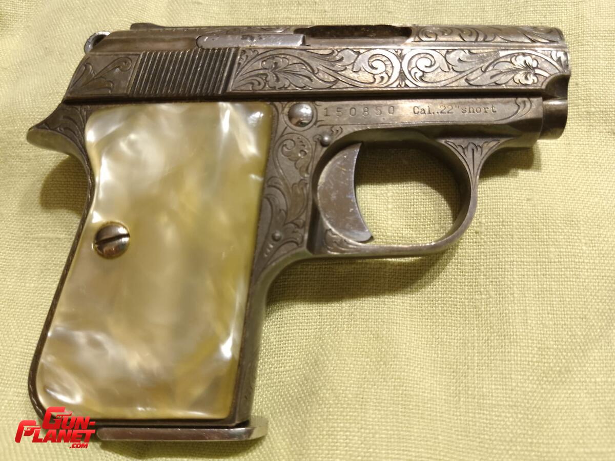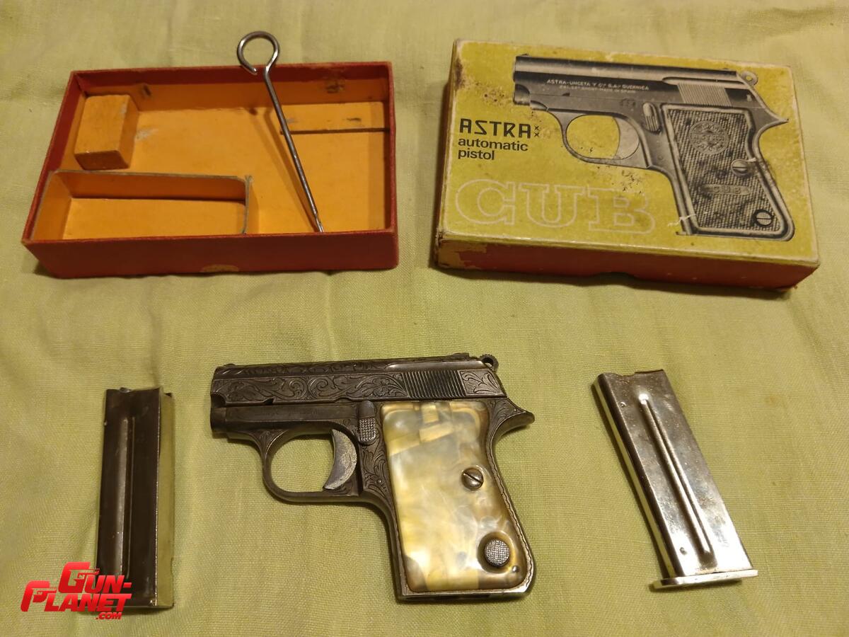 Pistola Astra CUB 22 corto con cachas de nácar y en su caja original.