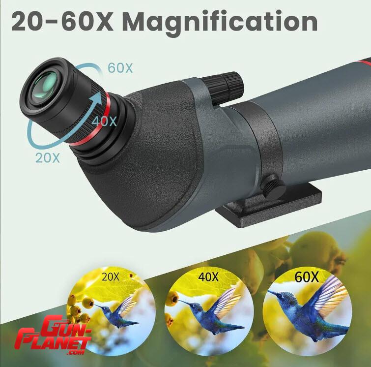 Aumento Variable 20x-60x: Pasa de un campo de visión amplio (20x) a un acercamiento extremo (60x) para ver cráteres lunares o el plumaje de un ave a gran distancia.
